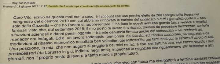 Sia chiaro nulla di di illegittimo o di illegale. Ma è forte, a nostro avviso, la “stonatura” di una seconda promozione del giornalista-sindacalista Martellotta, allorquando 45 giornalisti della Gazzetta del Mezzogiorno subiscono un doloroso taglio professionale e intravedono lo spettro del licenziamento. Se non altro, una questione di mancanza di stile. E sopratutto di deontologia sindacale. Ma in Puglia non è una novità. Infatti lo avevamo già raccontato lo scorso 1 novembre 2023 con un nostro articolo (leggi QUI) che tanto ha infastidito l’ “ego” di Mimmo Mazza. Che questa volta si è ben guardato dal fare la sua solita querela-denuncia.