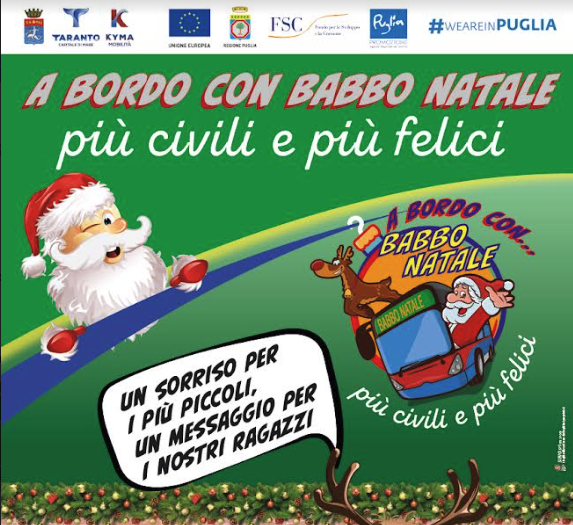 Ma insieme alla riqualificazione urbana e sociale va evidentemente ricostituita la condizione di rispetto delle regole e del vivere civile. Sulla base di queste semplici considerazioni è nata l’iniziativa “A bordo con Babbo Natale, più civili, più felici”, progetto ideato e realizzato da Sirio Srl società specializzata in marketing ed organizzazione di eventi, che ha trovato in Kyma Mobilità Taranto e Comune di Taranto e Puglia Promozione, i partners ideali per mettere a sistema tre concetti: il Natale, il coinvolgimento delle periferie, il rispetto del mezzo pubblico, il Bus, appunto, oggi sempre più spesso preso di mira, violato, oltraggiato. Un’idea che ha trovato riscontro nei valori promossi da Puglia Promozione che scommette sulle buone idee che possono diffondere il brand Puglia.