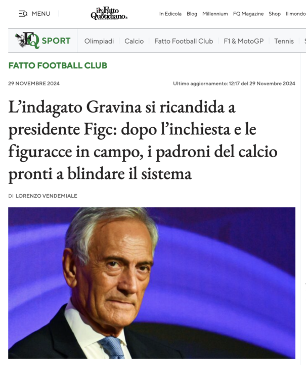 Continuava così il Fatto Quotidiano: “l’ inchiesta a suo carico rimane l’unico vero ostacolo alla rielezione, anche se pure su quello il presidente ha già messo le mani avanti: alla fine le norme non lo obbligherebbero a dimettersi nemmeno in caso di eventuale rinvio a giudizio, che tra l’altro a questo punto potrebbe arrivare anche dopo il voto. Comunque, nella peggiore delle ipotesi, sarebbe già pronto il vecchio Abete a prendere il suo posto, per tutelare il “sistema Gravina”. Lo stesso che ha portato ad anni di immobilismo totale, amministrazione opaca del potere, fallimenti di ogni tipo sportivi e gestionali. E che i padroni del pallone sono pronti a scegliere ancora. Questo è il calcio italiano“.