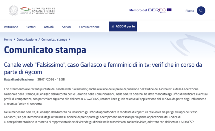 “Con riferimento alle recenti puntate del canale web “Falsissimo”, anche alla luce delle prese di posizione dell’Ordine dei Giornalisti e della Federazione Nazionale della Stampa, il Consiglio dell’ Autorità per le Garanzie nelle Comunicazioni, nella seduta odierna, ha dato mandato agli Uffici di verificare eventuali profili di competenza, con particolare riguardo alla delibera n.7/24/CONS, recante linee guida relative all’applicazione del TUSMA da parte degli influencer e al relativo Codice di condotta”. Lo rende noto l’ Agcom.