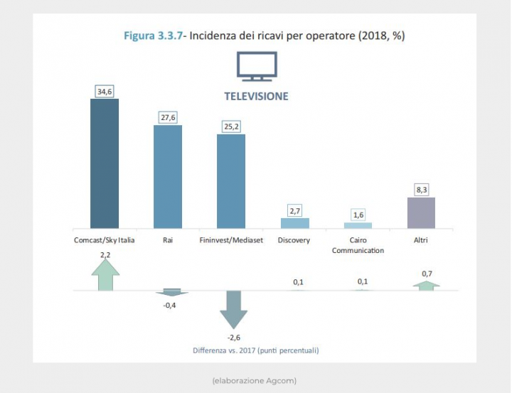 Nel settore televisivo, si evidenzia la sostanziale stabilità nell’ultimo periodo della posizione di Sky del gruppo Comcast Corporation che, con oltre il 15%, rappresenta nel 2017 il primo operatore del Sic. Diversamente, per i principali gruppi editoriali nazionali (Gedi e Cairo/RCS), si assiste a un’involuzione nel tempo del loro peso sul totale, nonostante tali operatori siano stati protagonisti di recenti processi di integrazione orizzontale. Mantengono invece posizioni  di stabilità i due operatori storici, Rai (14,1%) e Fininvest (15,2%), che complessivamente rappresentano quasi un terzo del Sic.