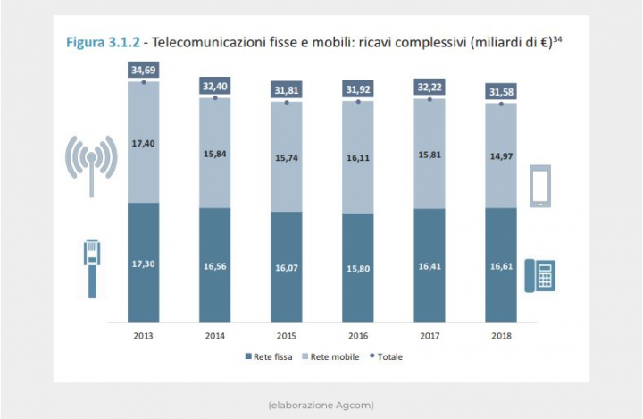 Le risorse del settore telecomunicazioni, rete fissa e mobile, si riducono del 2%, raggiungendo un giro d’affari di 31,6 miliardi di euro, dopo la ripresa del 2016- 2017. Gli investimenti in infrastrutture invece crescono del 17%, con un aumento di 8,4 miliardi di euro, a seguito dei processi di infrastrutturazione nella rete fissa e per l’avvio della rete mobile 5G. Cresce il peso di Tim nella spesa per i servizi di rete fissa e mobile di famiglie e imprese e arriva al 46,1%, in aumento di 0,9 punti percentuali sul 2017. Vodafone e Wind Tre si collocano intorno al 20%. Rispettivamente questi operatori hanno quote del 19,7% (in calo di 0,5 punti percentuali) e del 19,1% (in calo di 1,5 punti).