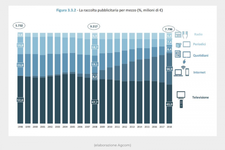 I media tradizionali più forti in termini di investimenti pubblicitari, come la televisione e le radio, sono rimasti piuttosto stabili lungo tutto il periodo, con la sola eccezione degli anni di recessione economica. D’altra parte, le risorse in pubblicità assorbite da internet sono aumentate nel tempo: partendo da livelli marginali rispetto agli altri settori (8 milioni di euro nel 1998) nel 2018 i ricavi hanno superato i 2,7 miliardi di euro, giungendo, così, a pesare il 35% sul totale degli introiti dei media