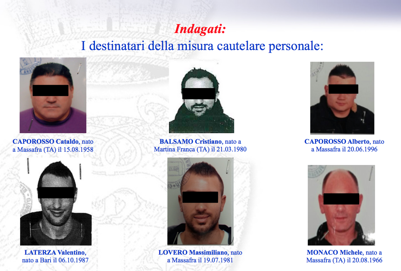 Nel corso delle indagini sono emersi chiari ed inequivocabili elementi in ordine all’esistenza di un sodalizio criminale avente connotazioni tipiche mafiose, influente sul territorio di Massafra (TA) ed aree limitrofe i cui sodali hanno dimostrato di essere pienamente consapevoli della loro appartenenza ad una consorteria strutturata gerarchicamente al cui vertice era il citato Caporosso.