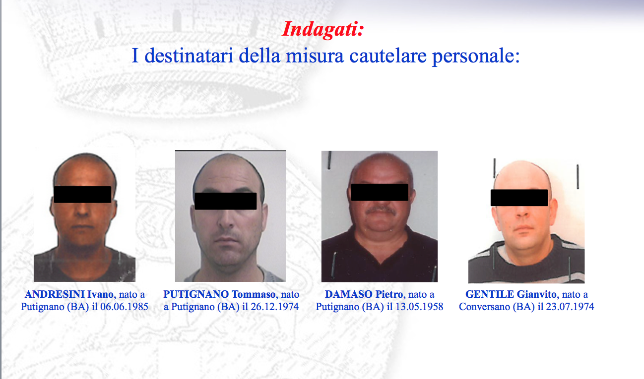 Nel corso dell’attività sono emerse inoltre fonti di prova utili a dimostrare cointeressenze criminali tra il gruppo riconducibile al Caporosso e quello diretto dal Putignano, residente nel vicino comune di Putignano (BA) ove quest’ultimo era, all’epoca delle indagini, sottoposto alla misura di prevenzione della Sorveglianza Speciale di P.S..In particolare è stata documentata l’esistenza di una fiorente attività di traffico e spaccio al dettaglio di ingenti quantitativi di sostanza stupefacente del tipo cocaina, commercializzata da una fitta rete di pusher, grazie a periodici rifornimenti di stupefacente da un altro gruppo criminale del posto capeggiato da Riccardo Sgaramella , detto “Salotto” operante nella vicina città di Andria (BAT).