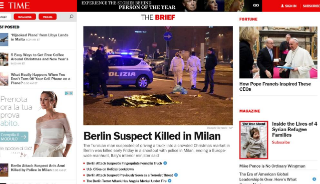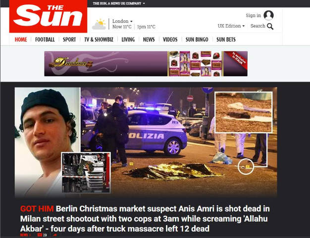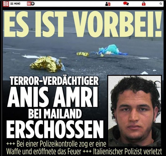 La volante della Polizia si ferma, scendono i due poliziotti che senza immaginare chi possa essere si avvicinano all’uomo e come sempre chiedono i documenti . L’uomo si leva lo zainetto che portava sulle spalle, lo appoggia a terra. Gli agenti si aspettavano che prendesse i documenti. Ma invece tira fuori una pistola, probabilmente la stessa calibro 22 con cui ha ucciso l’autista polacco del Tir a Berlino, e comincia a sparare. Venendo ucciso dai colpi degli agenti della Polizia italiana. per i quali però ci sono molte cose che non quadrano. Come mai un balordo, sorpreso in piena notte, reagisce in una maniera tanto violenta? Addirittura sparando, e secondo le ricostruzioni, pronunciando la parola simbolo dei terroristi islamici: “Allah akbar“. Infatti se fosse stato uno dei tanti spacciatori che frequentano la zona non si sarebbe mai comportato in una maniera del genere. La perquisizione dello zaino racconta delle cose che allarmano immediatamente la Polizia: all’interno trovano prodotti tedeschi, non ci sono documenti, quei documenti lasciati sul camion nero lanciato contro la folla del mercatino di Natale a Berlino. Ma gli investigatori hanno un sospetto e decidono di prendere le impronte digitali. Dopo poche ore arriva la conferma: è proprio lui, il killer di Berlino.