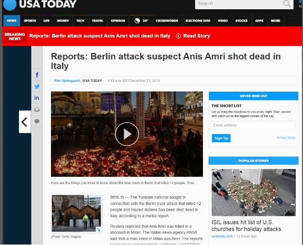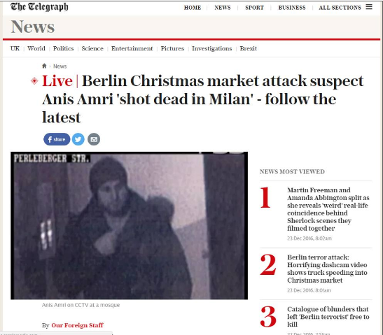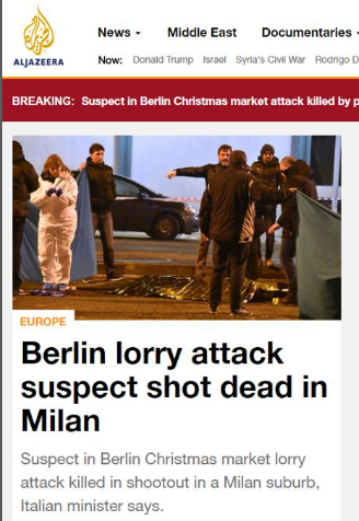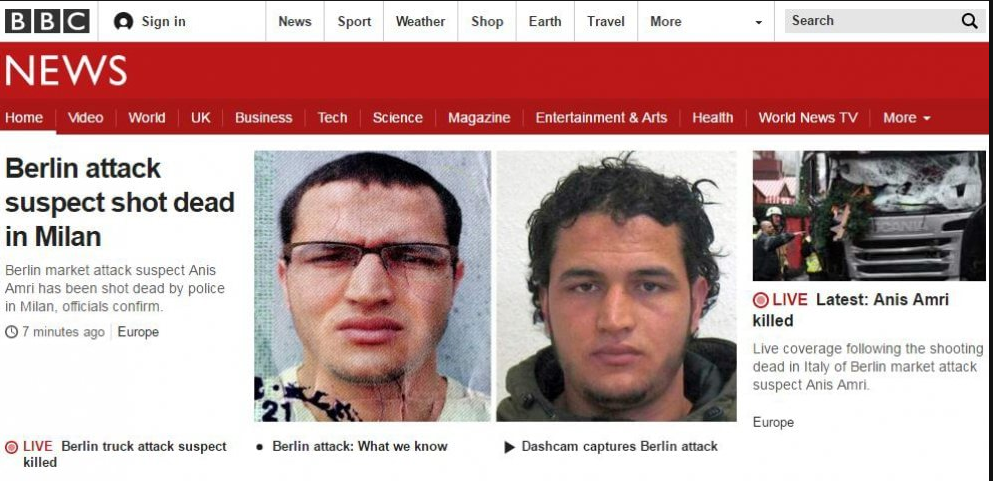 Il terrorista jihadista Anis Amri, che a Berlino lanciando un tir nel mercatino di Natale ha provocato 12 morti, è stato ucciso dopo un conflitto a fuoco con la Polizia di Stato, ed è stato identificato grazie impronte digitali e dalle dimensioni della faccia. Era arrivato in Italia, a Sesto San Giovanni. Che si tratti dell’ attentatore di Berlino, lo conferma “senza ombra di dubbio” il ministro dell’Interno Marco Minniti, e prima di lui, lo hanno accertato gli esperti dell’antiterrorismo della Digos di Milano.