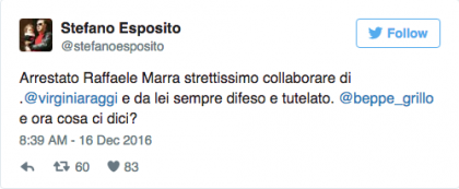 Al momento dal Movimento 5 stelle filtrano pochi commenti: l’ufficio comunicazione sta cercando di inventarsi una linea difensiva. Pochi i 5 Stelle che commentano l’accaduto: avvicinati dai giornalisti proprio mentre stavano per salire sul pullman che li avrebbe portati a Siena, i parlamentari pentastellati concordano sulla necessità che “la magistratura faccia il suo corso”. “Prima le tardive dimissioni della Muraro, poi le perquisizioni in Campidoglio, oggi l’arresto di Marra: quando dissi che stavano riciclando il peggio, quando raccontai i legami pericolosi di questa gente, Grillo, Di Battista e Di Maio mi insultarono. Oggi non chiederanno scusa. Perchè sono politicamente corresponsabili”.