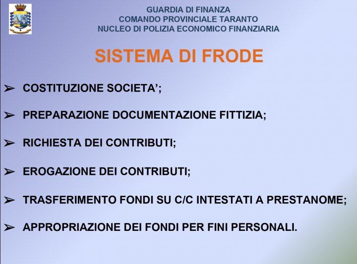 Il provvedimento, emesso dal G.I.P. dr. Giuseppe Tommasino del Tribunale di Taranto , su proposta del P.M. dr.ssa Daniela Putignano della locale Procura della Repubblica, fa seguito alle indagini già condotte dal Nucleo di Polizia Economico Finanziaria, nell’ambito delle quali sono state individuate 17 imprese, tutte comunque riconducibili alle suindicate persone, costituite unicamente al fine di poter accedere a fondi europei cofinanziati dallo Stato e dalla Regione Puglia, destinati ad incentivare l’occupazione femminile.