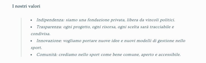 Ed il trionfo della è che nel sito della Fondazione si legge che “I nostri valori sono Indipendenza: siamo una fondazione privata, libera da vincoli politici” aggiungendo ” Trasparenza: ogni progetto, ogni risorsa, ogni scelta sarà tracciabile e condivisa” Peccato che così non è accaduto ! Per non parlare della millantata “Innovazione” sostenendo che “vogliamo portare nuove idee e nuovi modelli di gestione nello sport”.