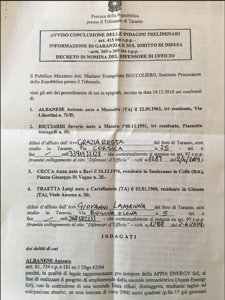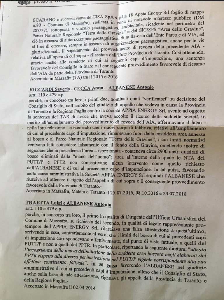 Il fascicolo d’indagine della Procura di Taranto, affidato al pm Mariano Buccoliero, coinvolge a vario titolo l’imprenditore massafrese Antonio Albanese, quale rappresentante legale della società Appia Energy, Luigi Traetta dirigente dell’ufficio di Urbanistica del Comune di Massafra, ed i verificatori Saverio Riccardi e Anna Cecca periti–incaricati dal Consiglio di Stato. Albanese è chiamato a rispondere del reato di “distruzione di bellezze naturali” (art. 734 C.P) e di “falso ideologico” (art. 479 C.P) in concorso con gli altri indagati coinvolti.