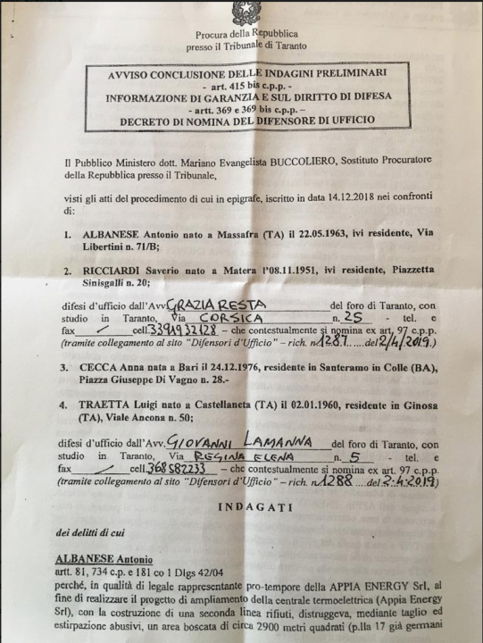 Sulla base delle evidenze emerse nel corso delle indagini della procura di Taranto, Antonio Albanese avrebbe fatto scomparire un’area boschiva di circa 2900 metri quadrati, con l’obiettivo di poter ovviare al provvedimento di revoca della precedente Aia che era stata rilasciata dalla Provincia di Taranto e rientrare quindi nelle norme di legge previste e necessarie per sviluppare il progetto di raddoppio della centrale di Appia Energy.