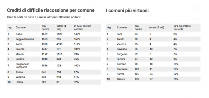 Viceversa, le regioni con i Comuni più virtuosi, con un credito non riscosso pro-capite inferiore ai 100 euro, risultano Trentino Alto Adige (51 euro), Veneto (56), Friuli Venezia Giulia (70) e Lombardia (84), Piemonte (94), Marche (96).