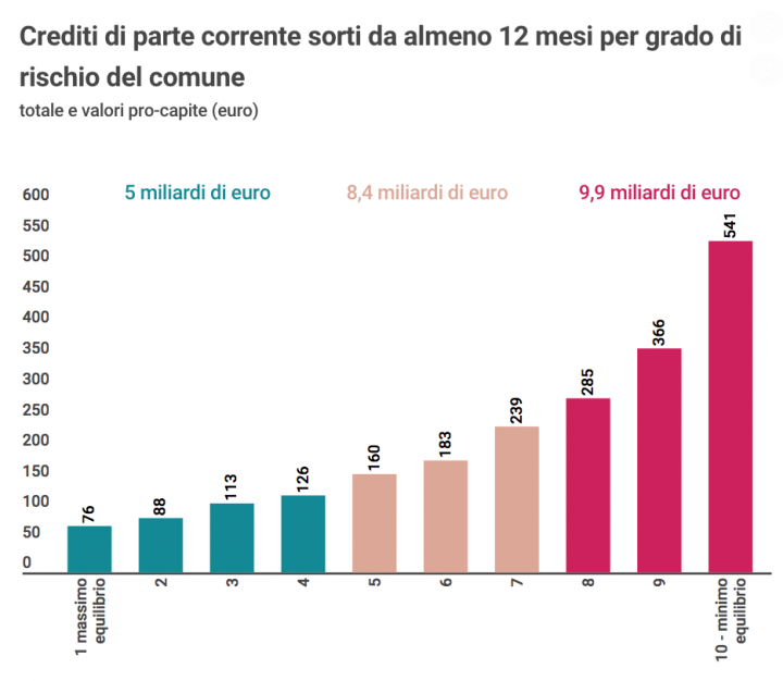 Si tratta di crediti di parte corrente – tasse come IMU, TARI, TASI, TOSAP (occupazione di spazi pubblici), ma anche entrate patrimoniali come multe stradali o rette scolastiche – che però sono sorti da almeno 12 mesi e quindi vanno contabilizzati in una specifica voce di bilancio. Parliamo di quasi la metà del totale delle entrate (47%) che siccome non è stata incassata entro un anno ha un’alta probabilità di non venire incassata mai, perché più passa il tempo e peggio è.