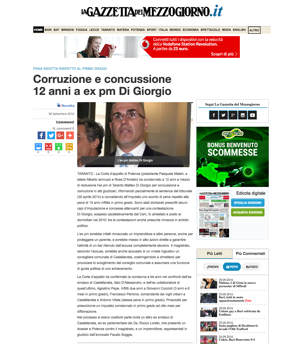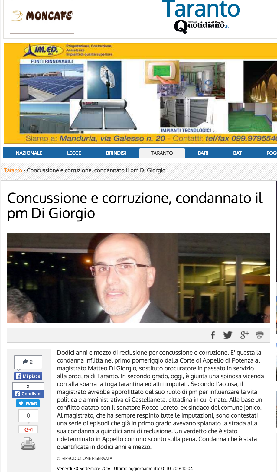 Il pm Matteo Di Giorgio precedentemente in servizio presso la Procura di Taranto, attualmente sospeso dal servizio, dovrà scontare 12 anni e sei mesi di reclusione per i reati di “concussione” e “corruzione“. Lo ha deciso dopo una camera di consiglio durata cinque ore la Corte d’appello del Tribunale di Potenza, che alla fine del processo di secondo grado ha ridotto di soli 3 anni la pena inflitta rispetto ai 15 anni decisi dal Tribunale nel maggio del 2014 nel processo di primo grado, dichiarando l’intervenuta prescrizione per decorrenza dei termini alcuni dei capi d’imputazione a suo carico e rivisto le attenuanti riconosciute per un’altra accusa. Di Giorgio è stato difeso dall’ Avv. Donatello Cimadomo del Foro di Potenza, che aveva assunto la difesa in altri procedimenti connessi anche di altri magistrati fra cui l’attuale Procuratore aggiunto di Taranto Pietro Argentino.