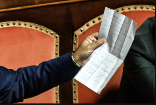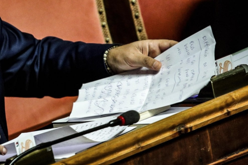 Il leader della Lega ha scritto le ultime note in aula, poco prima di intervenire nel corso del dibattito che ha preceduto il voto. Tra gli appunti si distingue la frase “differenza di stile”, riferita al premier Conte, accusato di “sussurrare nell’orecchio di Merkel”