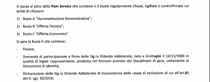 Ma abbiamo scavato nel passato della Orlando ed abbiamo scoperto che, mentre era dipendente dell’ ASL partecipava con la Cooperativa in qualità di rappresentante legale a dei bandi di gara dell’ ASL TARANTO sottoscrivendo persino un dichiarazione di insussistenza delle cause di esclusione, in un bando di gara del valore di oltre 100mila euro !