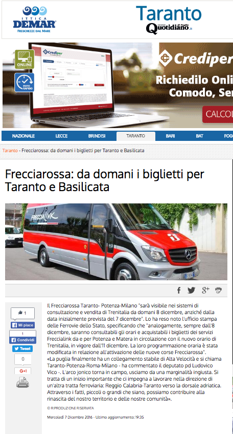 A partire da domenica 11 dicembre partirà, il servizio di Trenitalia che porterà il treno FrecciaRossa ad arrivare in Basilicata ed a Taranto. Non lo hanno comunicato ed ottenuto il Governatore pugliese Emiliano o il Sindaco di Taranto Stefàno. Infatti a comunicarlo ufficialmente è stato Nicola Benedetto, assessore ai trasporti della Regione Basilicata, in una conferenza stampa svoltasi questa mattina presso la Sala Verrastro. A viaggiare sui binari lucani, con capolinea a Taranto sarà un Freccia1000, un treno di nuovissima costruzione con una capienza di 457 posti, tutto made in Italy, eco-sostenibile (il primo al mondo) e silenzioso, che partirà da Taranto e fermerà nelle stazioni lucane di Ferrandina, Metaponto e Potenza Centrale per continuare poi verso Salerno, Napoli, Roma, Firenze, Bologna e Milano.
