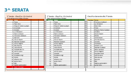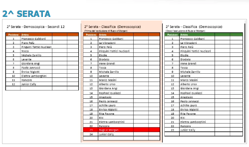 La giuria della Sala Stampa ha relegato agli ultimi tre posti tre cantanti provenienti da Amici , con il piazzamento di Giordana Angi, al 22esimo posto sia per la Demoscopica, sia per la Sala stampa (e 16^ per il pubblico da casa).