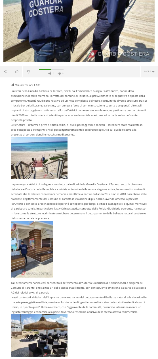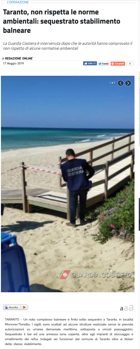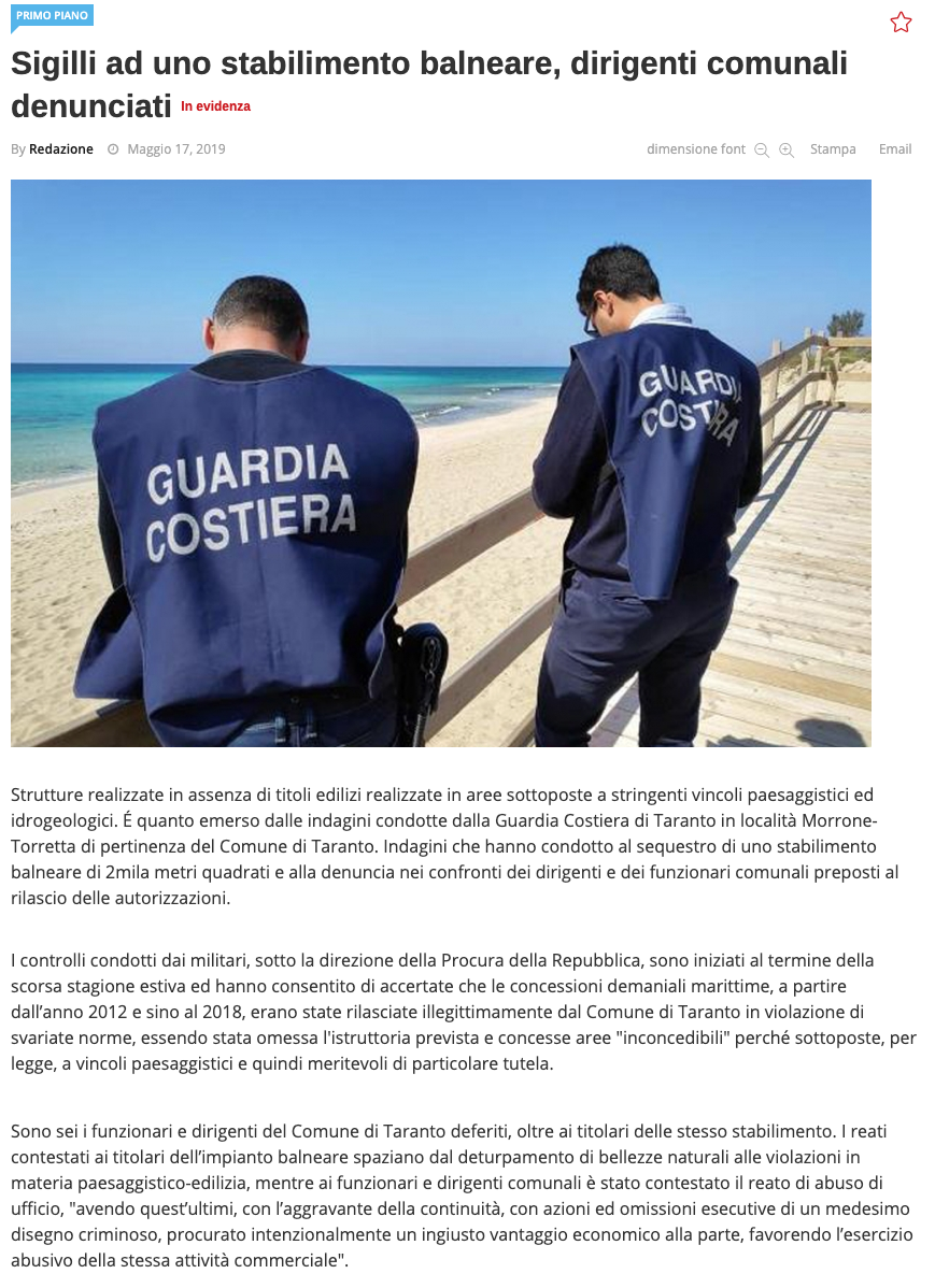 Gli accertamenti hanno così consentito il deferimento all’Autorità Giudiziaria di ben sei dirigenti e funzionari del Comune di Taranto, oltre ai titolari delle stesso stabilimento, con conseguente emissione da parte della stessa Autorità Giudiziaria dei relativi avvisi di garanzia. I reati contestati ai titolari dell’impianto balneare, spaziano dal deturpamento di bellezze naturali alle violazioni in materia paesaggistico-edilizia, mentre ai funzionari e dirigenti comunali è stato contestato il reato di abuso di ufficio, avendo quest’ultimi, con l’aggravante della continuità, con azioni ed omissioni esecutive di un inconfutabile disegno criminoso, procurato intenzionalmente un ingiusto vantaggio economico alla parte, favorendo l’esercizio abusivo della stessa attività commerciale.