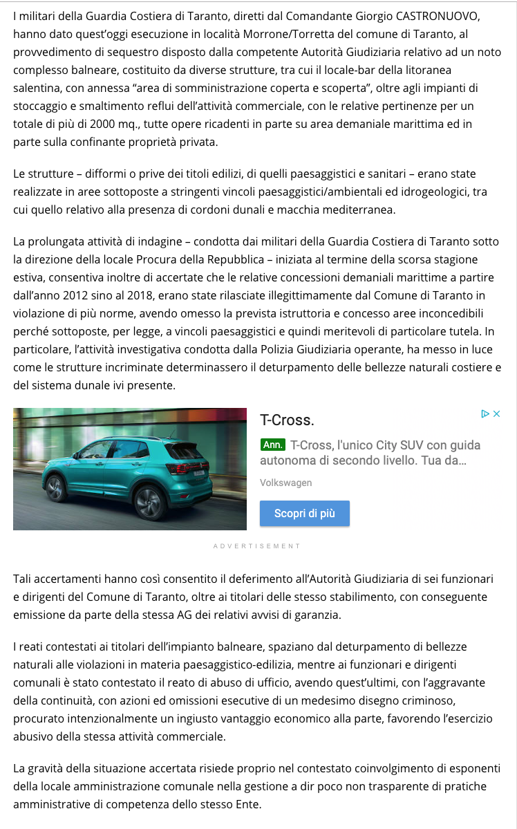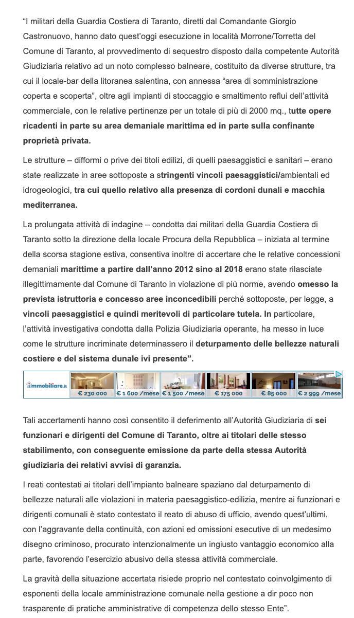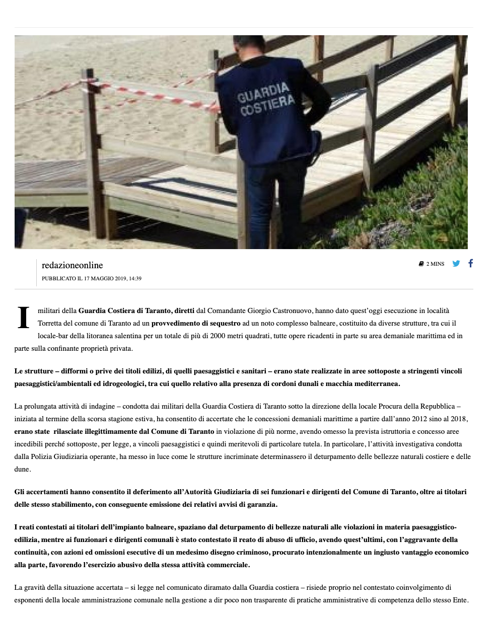 La prolungata attività di indagine condotta dai militari della Guardia Costiera di Taranto sotto il coordinamento del pm dr. Mariano Buccoliero della locale Procura della Repubblica, iniziata al termine della scorsa stagione estiva, ha consentito di accertate che le relative concessioni demaniali marittime a partire dall’anno 2012 sino al 2018, erano state rilasciate illegittimamente dal Comune di Taranto in violazione di più norme, avendo omesso la prevista istruttoria e concesso aree inconcedibili perché sottoposte, per legge, a vincoli paesaggistici e quindi meritevoli di particolare tutela. In particolare, l’attività investigativa condotta dagli ufficiali della Polizia Giudiziaria operante, ha messo in luce come le strutture incriminate determinassero il deturpamento delle bellezze naturali costiere e del sistema dunale .