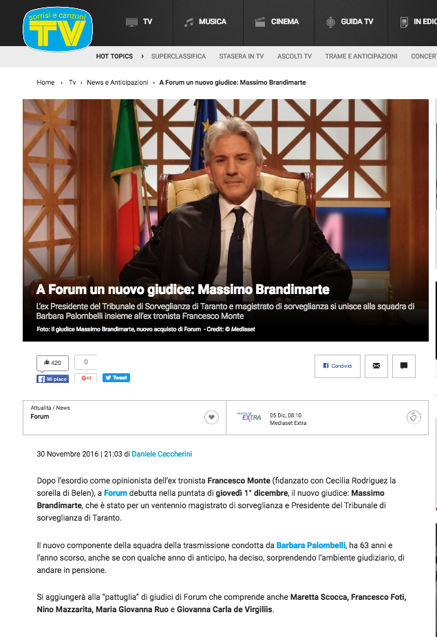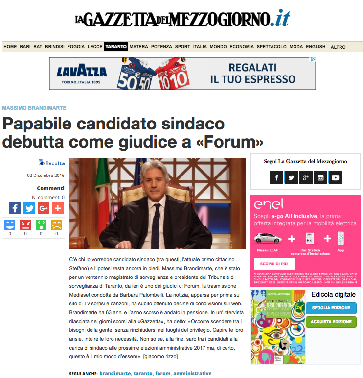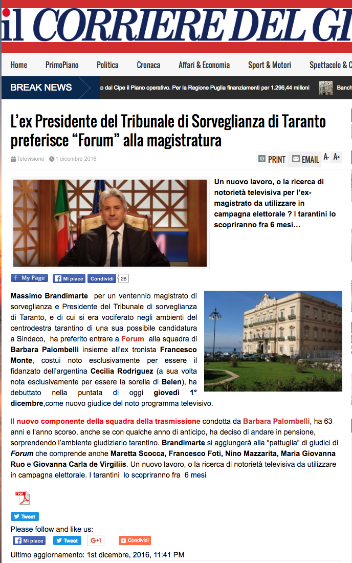 Leggete cosa scriveva Giacomo Rizzo, 24 ore dopo il nostro articolo: “C’è chi lo vorrebbe candidato sindaco (tra questi, l’attuale primo cittadino Stefàno) e l’ipotesi resta ancora in piedi. Massimo Brandimarte, che è stato per un ventennio magistrato di sorveglianza e presidente del Tribunale di sorveglianza di Taranto, da ieri è uno dei giudici di Forum, la trasmissione Mediaset condotta da Barbara Palombelli. La notizia, apparsa per prima sul sito di Tv sorrisi e canzoni, ha subito ottenuto decine di condivisioni sul web. Brandimarte ha 63 anni e l’anno scorso è andato in pensione. In un’intervista rilasciata nei giorni scorsi alla «Gazzetta», ha detto: «Occorre scendere tra i bisogni della gente, senza rinchiudersi nei luoghi del privilegio. Capire le loro ansie, intuire le loro necessità. Non so se, alla fine, sarò tra i candidati alla carica di sindaco alle prossime elezioni amministrative 2017 ma, di certo, questo è il mio modo d’essere». [giacomo rizzo]“