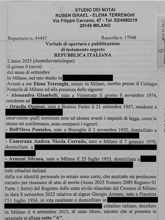 Lo stilista ha lasciato in eredità, poi, la piena proprietà, pari a una quota del 75%, della società L’Immobiliare Srl a cui fanno capo gli immobili detenuti a Saint Tropez, Antigua, Broni nel Pavese, e Pantelleria, a sua sorella Rosanna e ai nipoti Andrea Camerana e Silvana Armani, ai quali lascia anche la restante quota pari al 25% in nuda proprietà, mentre l’usufrutto andrà invece a favore del compagno e braccio destro di una vita Leo Dell’Orco. Questo quanto ha stabilito lo stilista nel secondo dei testamenti depositati presso il notaio Elena Terrenghi, in data 2 aprile 2025.