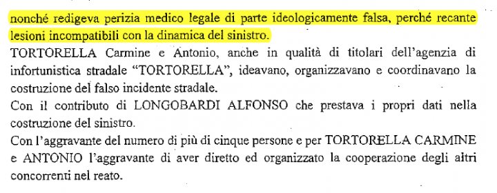 Il Gip Tommasino nella sua ordinanza scrive e sostiene che “solo i componenti della famiglia Tortorella vanno considerati partecipi di un sodalizio criminoso” aggiungendo che “in quel contesto ristretto si decidevano le linee di condotta e si effettuava la programmazione delle imprese delittuose”. Tutti gli altri indagati coinvolti nei 39 incidenti fasulli finiti nel mirino degli inquirenti “aderivano incondizionatamente in vista di un loro tornaconto personale di natura patrimoniale” ma si trattava di “prestazioni pur sempre occasionali, ancorché ripetitive“. In pratica “la corte di avvocati, medici, fisioterapisti, attori, falsi testimoni per professione” secondo il gip Tommasino “era esclusa completamente dalla fase decisionale”. Ma la decisione del Gip non è stata condivisa dal pubblico ministero dr.ssa Mannu che ha depositato il suo appello per ottenere l’arresto dei complici del “clan Tortorella“, come lo ha definito lo stesso gip Tommasino nella sua ordinanza.