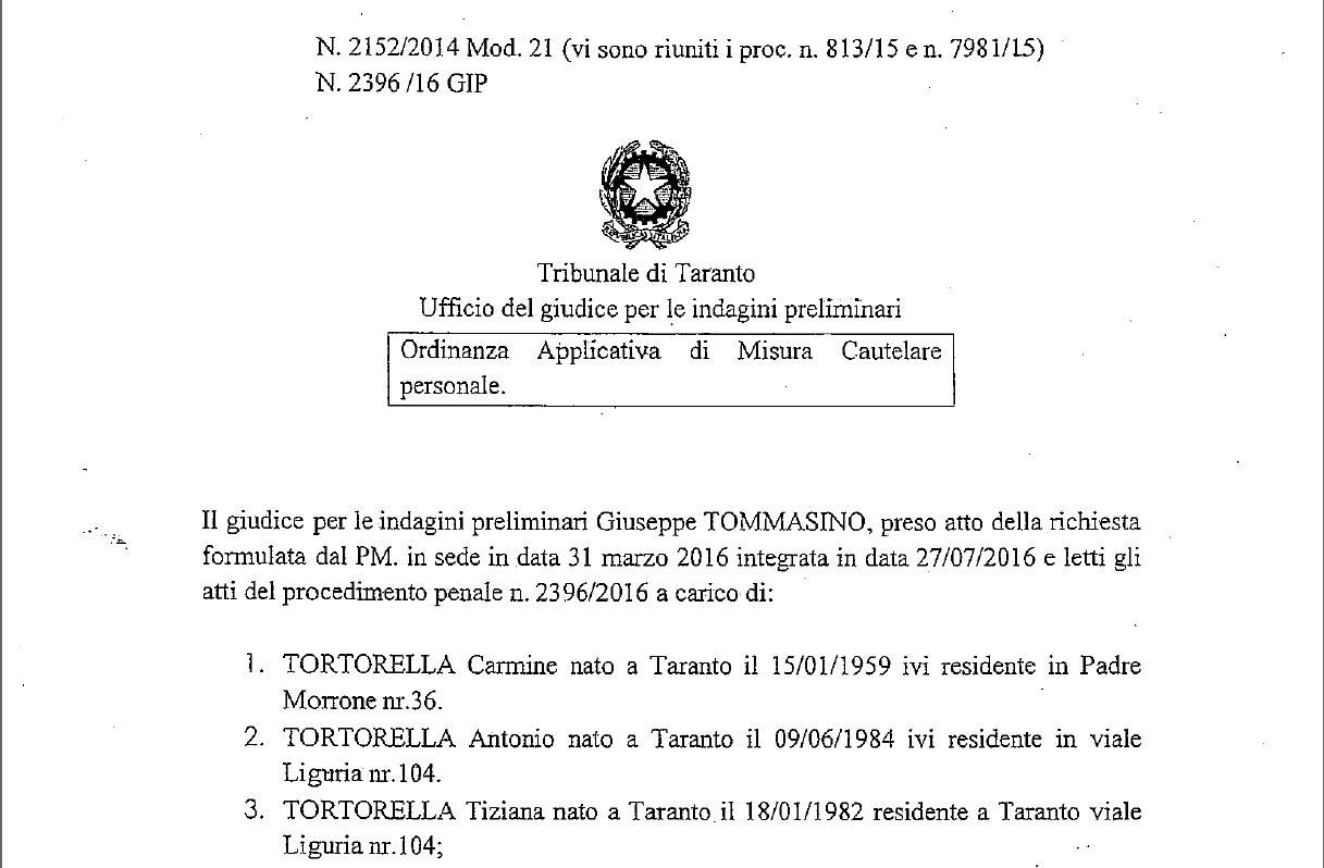 NOTA BENE: TUTTE LE PERSONE INCLUSE NELL’ORDINANZA DEL GIP DR. TOMMASINO DEL TRIBUNALE DI TARANTO NON SOTTOPOSTE AD ALCUN PROVVEDIMENTO DI DETENZIONE CAUTELARE , SONO ESCUSIVAMENTE “PERSONE SOTTOPOSTE AD INDAGINI ” ( CIOE’ ISCRITTE QUINDI NEL REGISTRO DEGLI INDAGATI DELLA PROCURA DI TARANTO) E QUINDI AL MOMENTO NON SONO “IMPUTATI”