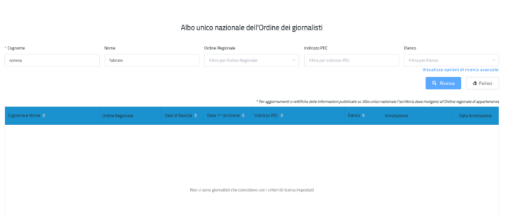 la prova estratta dal sito www.odg.it dell’ Ordine Nazionale dei Giornalisti che Corona non è giornalista