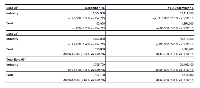 Ford Motor Company ha venduto, durante il 2016, 1,4 milioni di unità, tra vetture e veicoli commerciali, nei principali 20 mercati europei*, esprimendo una crescita del 5% rispetto al 2015 con una share del 7,9% e rafforzando la propria leadership come 1° costruttore di veicoli commerciali in Europa, con una penetrazione del 13,2% trainata, soprattutto, dalla crescita del Ford Transit e dalle vendite record del pick-up Ranger. Le vendite di SUV Ford sono cresciute del 31%, con risultati record per Kuga, EcoSport e Edge. Oltre il 75% delle vendite Ford, nei 5 mercati principali europei, ha interessato i canali a più alta marginalità, privati e flotte