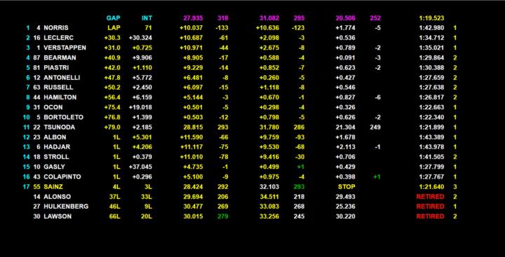 La McLaren di Lando scatta dalla pole e da lì non si scolla per tutti 71 giri della gara all’Hermanos Rodriguez, dove sul podio vanno anche Leclerc e Verstappen. Il ferrarista che conduce una gara solida, soffrendo nel finale il ritondo di un sontuoso Max, finto due volte sull’erba e con finisce mai di stupire. Incanta la Haas, quarta con un tostissimo Bearman e nona con Ocon, mentre Piastri limita i danni con un quinto posto che non gli permette in testa al campionato, ma almeno gli permette di tenere l compagno di squadra a una sola lunghezza di svantaggio. Partenza caotica, escursioni sull’erba e penalità, come 10’’ comminati a Hamilton per aver tratto vantaggio da un taglio della pista: chiude ottavo. Nel finale Leclerc riesce a resistere a Verstappen anche grazie a una Virtual Safety Car per problemi alla Williams di Sainz. Ultimo brivido di una gara che non dimenticheremo e che forse è uno snodo cruciale per il campionato.
