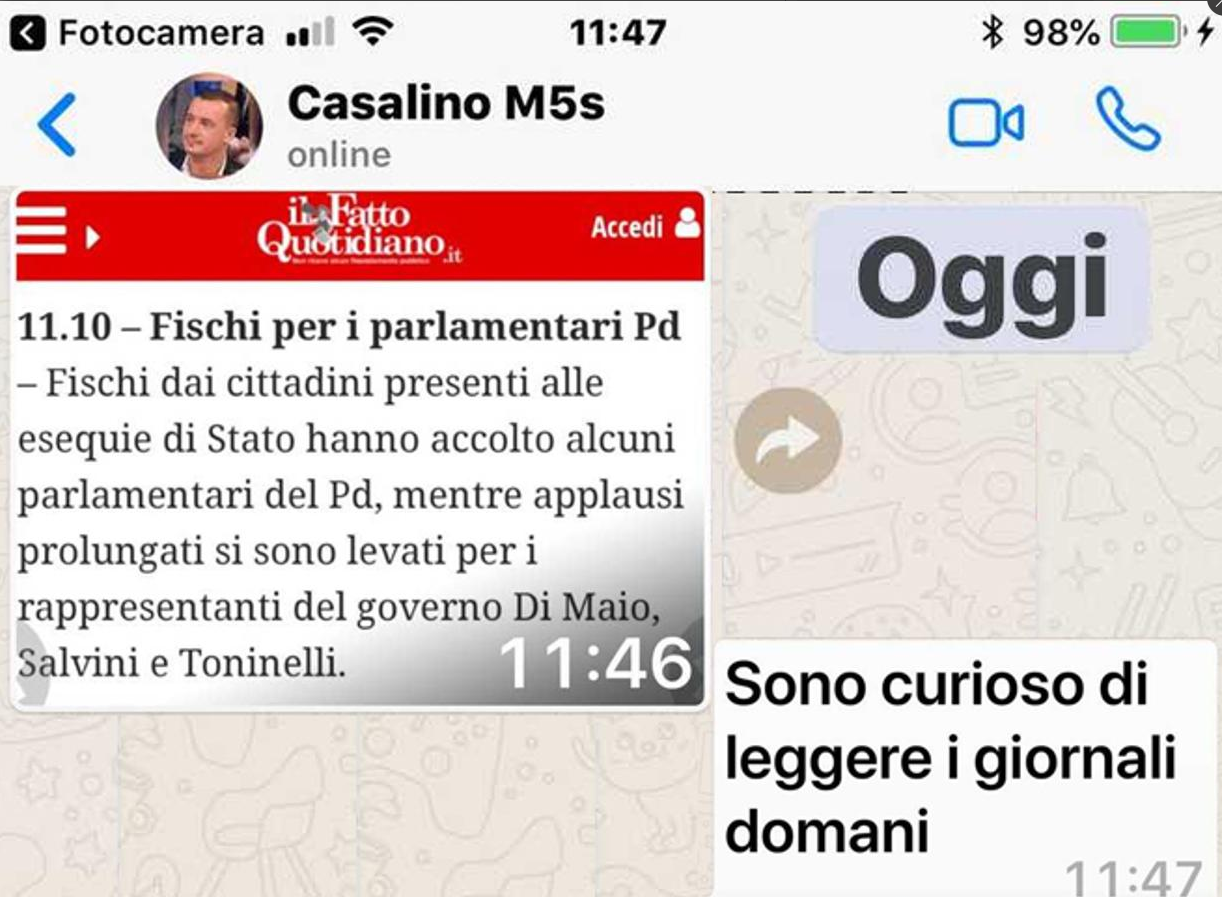 Poi, mentre la cerimonia funebre era già iniziata (come dimostrato dall’orario di invio della chat di WhatsApp), Rocco Casalino, ha sfidato la stampa scrivendo: “Sono curioso di leggere i giornali domani…”.