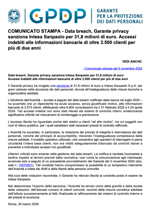 Garante della Privacy: maximulte da 17,6 e 31,8 milioni di euro al gruppo bancario IntesaSanpaolo