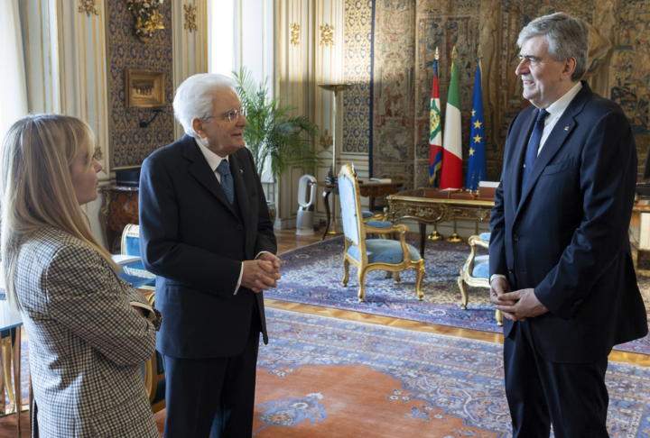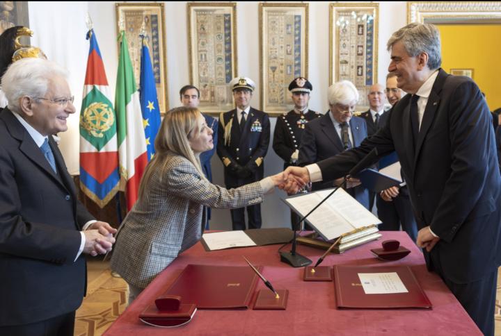 la premier Giorgia Meloni, il Capo dello Stato Sergio Mattarella ed il neo-ministro Gianmarco Mazzi