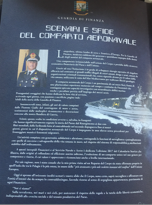 Il settore Aeronavale delle Fiamme Gialle quest’anno festeggia il bicentenario della propria istituzione, rappresenta una caratteristica importante della Guardia di Finanza, composto da uomini e donne specializzate e con professionalità che il Corpo nel corso dei due secoli di storia ha saputo affinare, integrando con le nuove tecnologie che il genio umano ha via via reso disponibili, in sinergia con il dispositivo territoriale per il controllo economico-finanziario di uno Stato come quello italiano che ha oltre 8mila chilometri e baricentrico rispetto al mar Mediterraneo