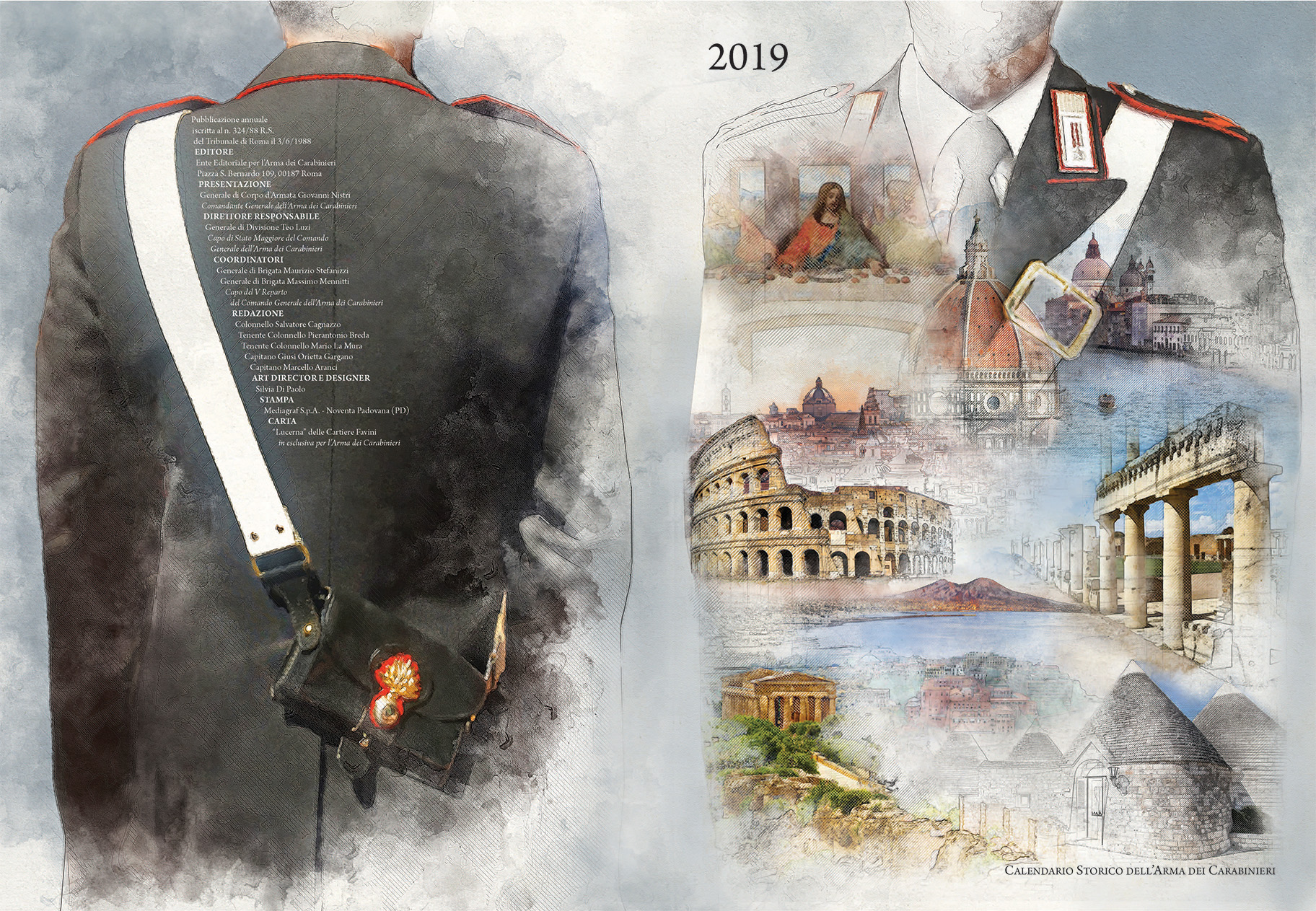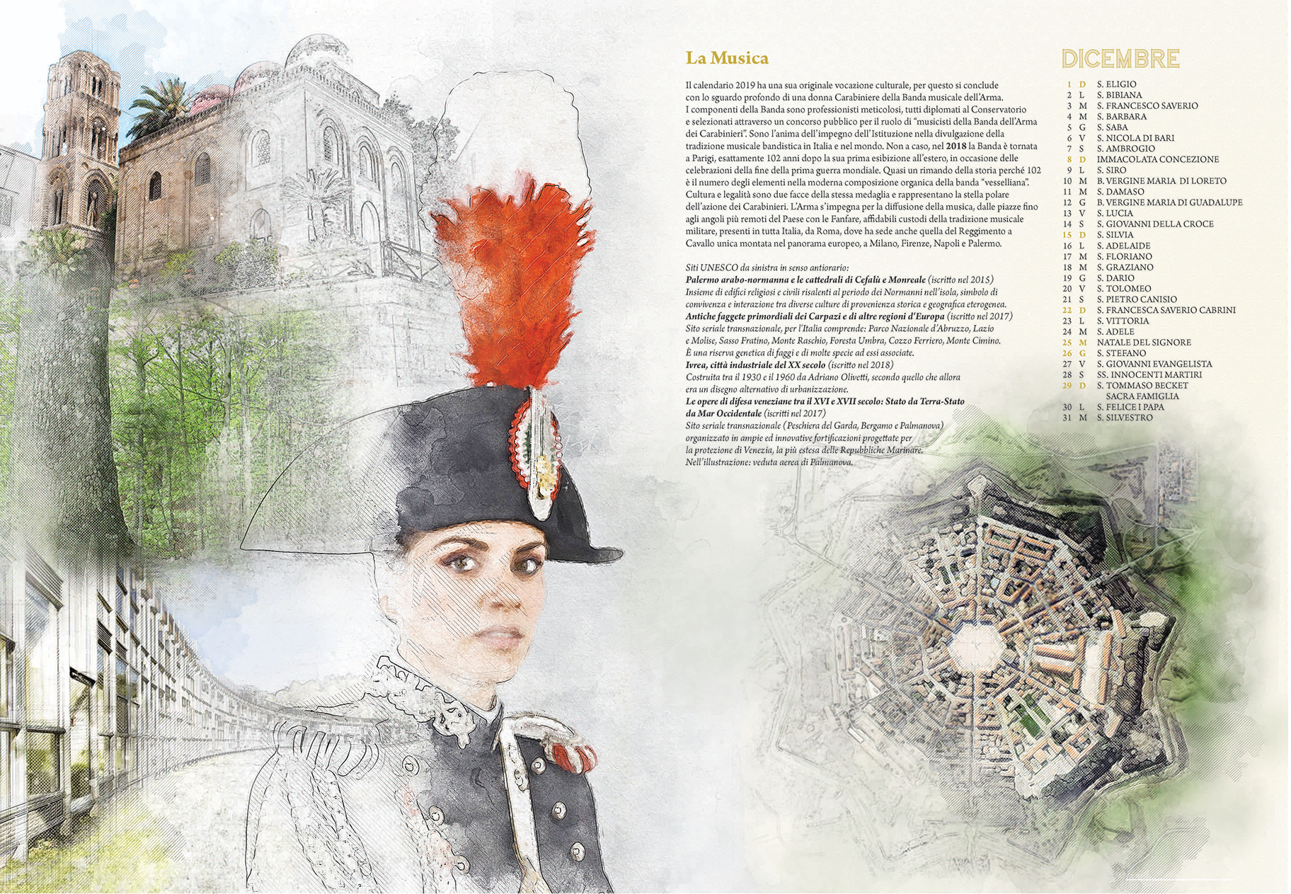 Il calendario dell’Arma, pubblicato dal 1928, con un’unica interruzione dovuta al secondo conflitto mondiale, è diventato per l’Italia intera un oggetto di culto, con una tiratura che ormai da molti anni sfiora il milione e mezzo di copie. L’edizione 2019 è incentrata sul tema dei siti Unesco italiani, in vista della ricorrenza dei 40 anni dall’inserimento del primo sito nel Patrimonio mondiale dell’umanità e, parallelamente, dei 50 anni dall’avvento dei Carabinieri per la Tutela del Patrimonio Culturale.Le preziose tavole a colori quest’anno riprendono una carrellata di siti italiani tutelati dall’Unesco, in parallelo è riportato il percorso evolutivo dei militari dell’Arma degli ultimi decenni. riprendono una carrellata di siti italiani tutelati dall’Unesco, in parallelo è riportato il percorso evolutivo dei militari dell’Arma degli ultimi decenni.