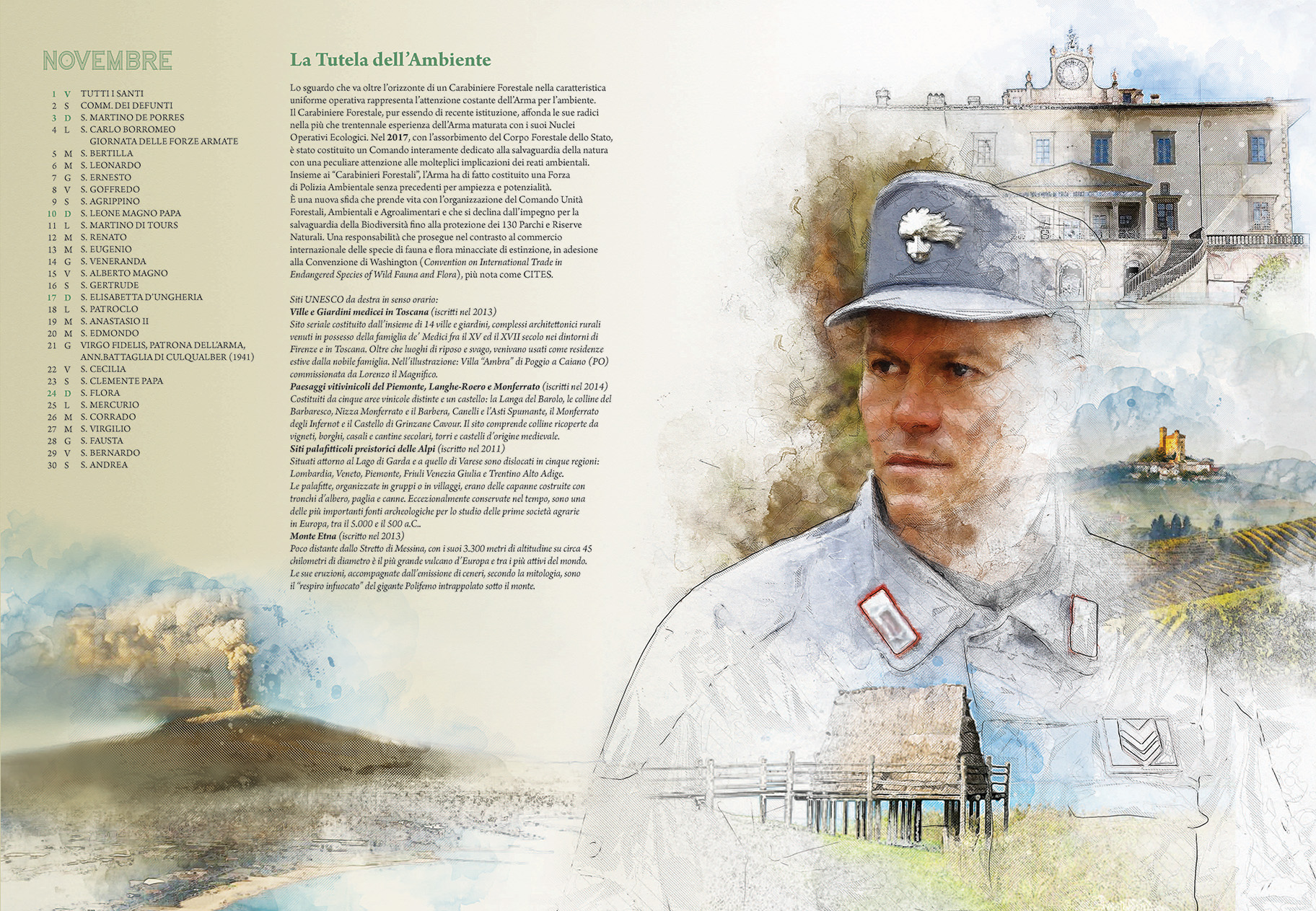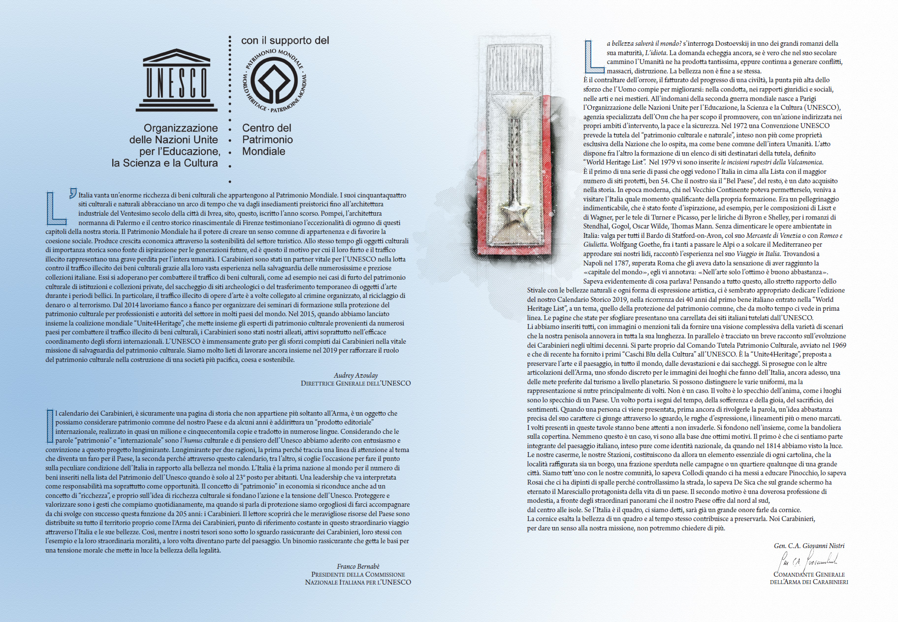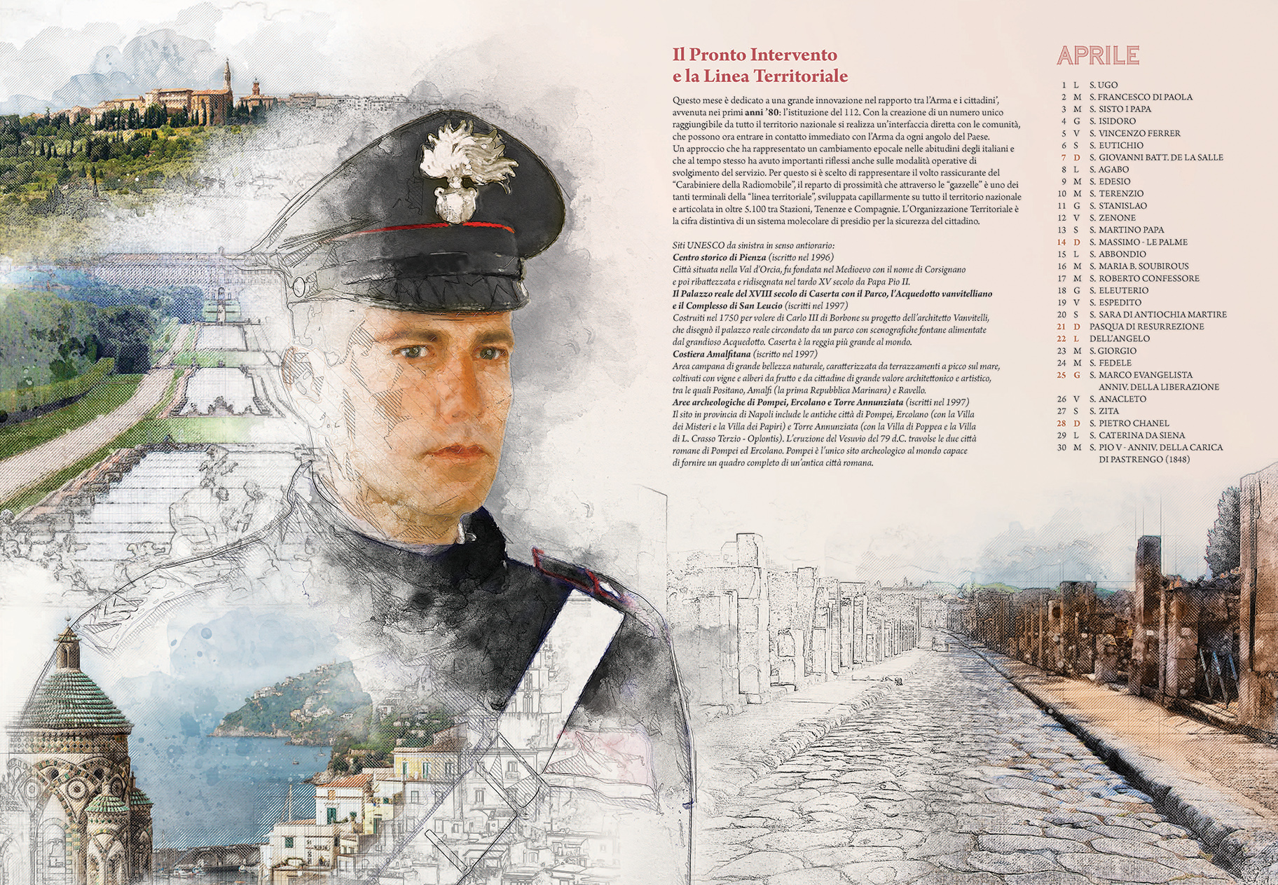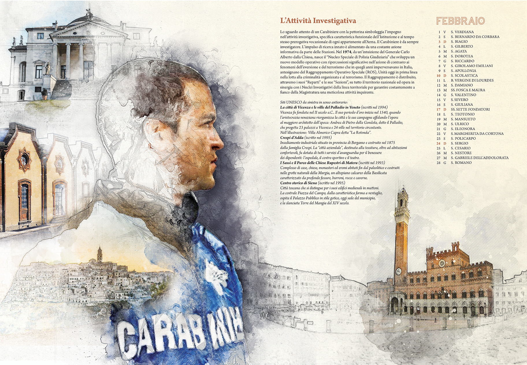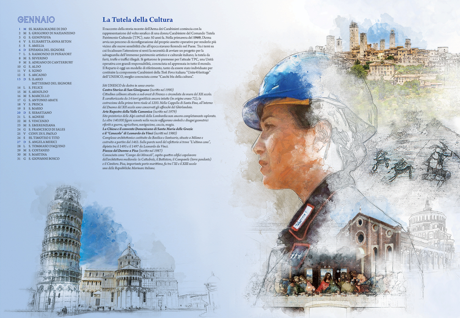 Le pagine del Calendario presentano una carrellata dei siti italiani tutelati dall’Unesco. Sono stati “inseriti tutti con immagini o menzioni tali da fornire una visione complessiva della varietà di scenari della nostra penisola” – ha dichiarato nel suo intervento il Comandante Generale Giovanni Nistri. In parallelo è riportato in breve il percorso evolutivo dei Carabinieri negli ultimi decenni, a partire dal Comando Tutela Patrimonio Culturale avviato nel 1969, che di recente ha fornito i primi “caschi blu della cultura” all’Unesco. Accompagnano le immagini dei luoghi simbolo della Nazione le altre articolazioni dell’Arma, attraverso la rappresentazione di uniformi e “principalmente di volti. Il volto” – ha proseguito il generale Nistri – “è lo specchio dell’anima, come i luoghi sono lo specchio di un Paese. E quelli presenti nelle tavole… stanno ben attenti a non invaderle. Si fondono nell’insieme…perché noi siamo e ci sentiamo parte integrante del paesaggio italiano, inteso come identità nazionale”.