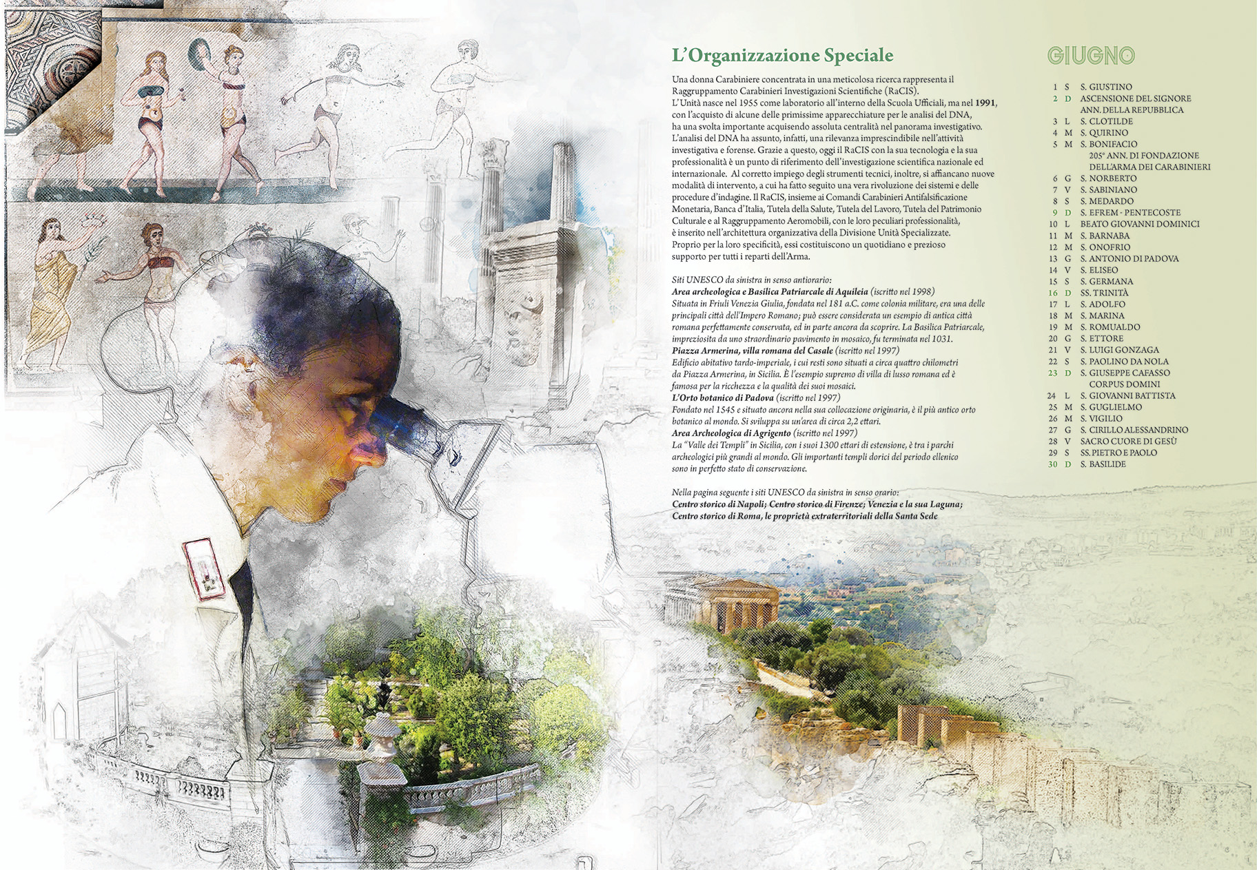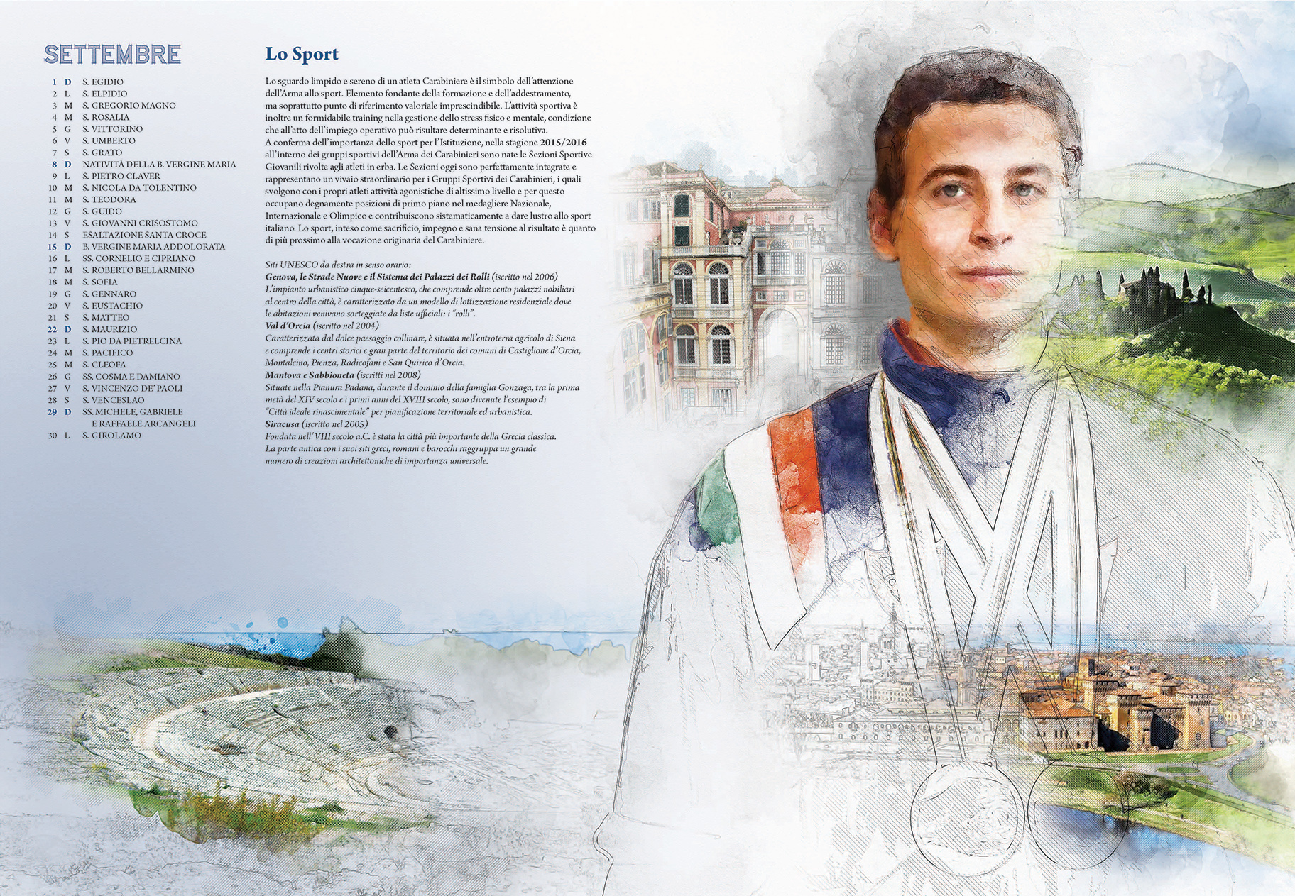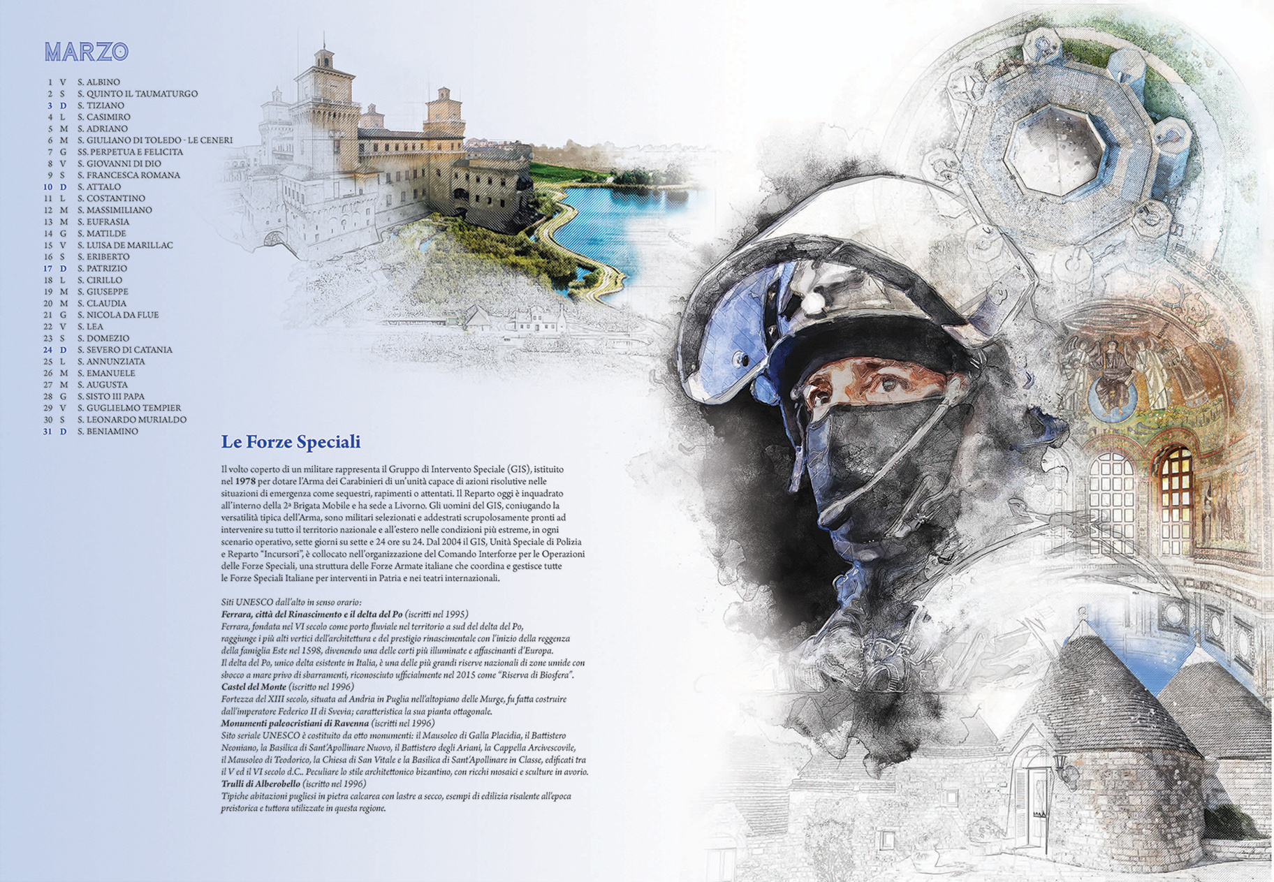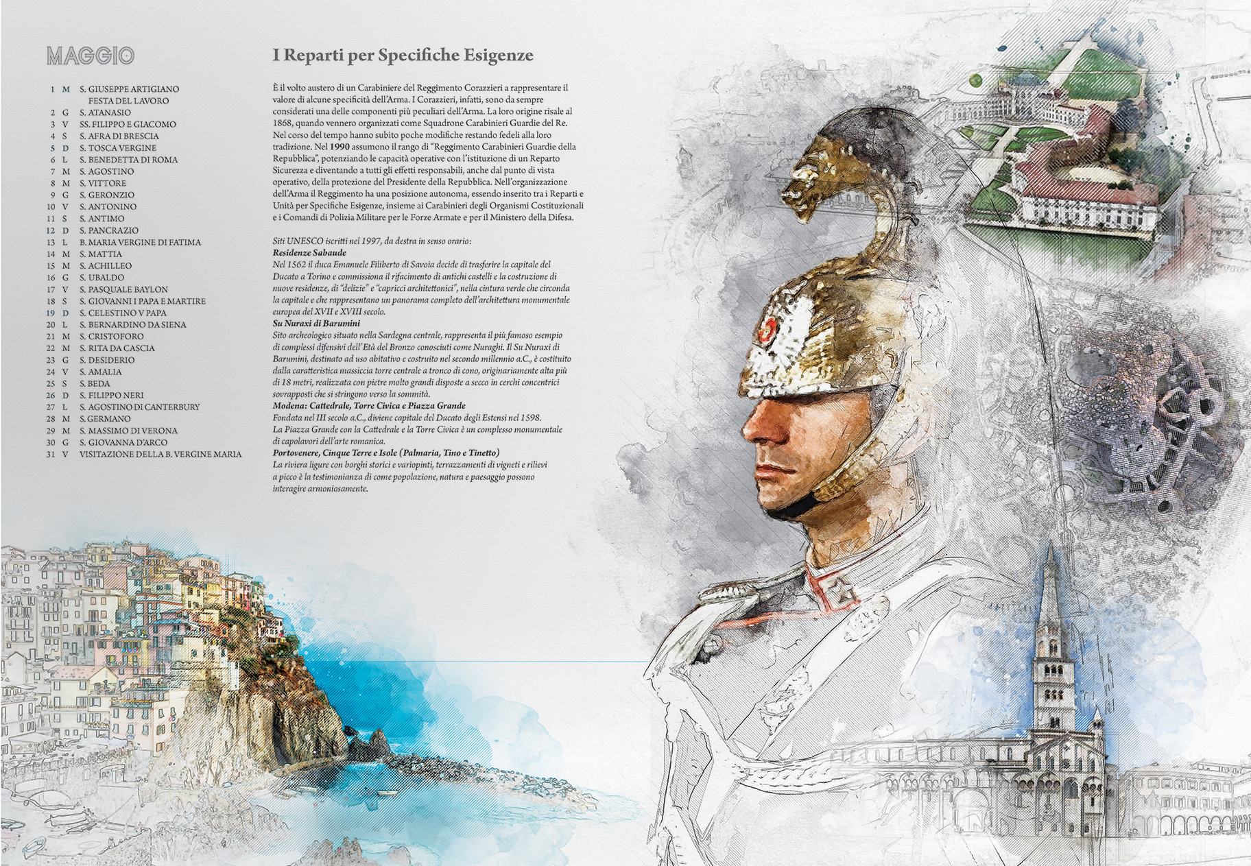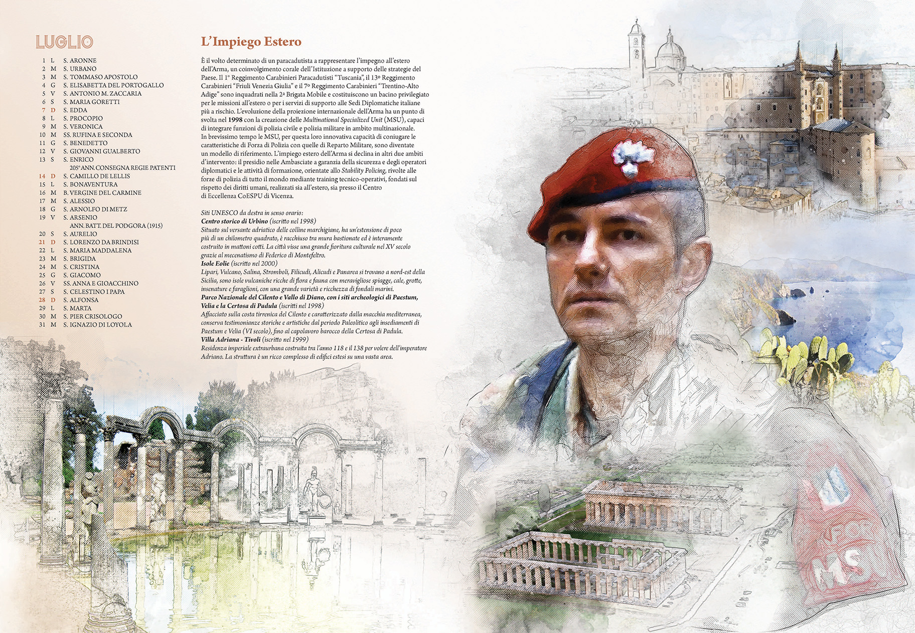Le pagine del Calendario presentano una carrellata dei siti italiani tutelati dall’Unesco. Sono stati “inseriti tutti con immagini o menzioni tali da fornire una visione complessiva della varietà di scenari della nostra penisola” – ha dichiarato nel suo intervento il Comandante Generale Giovanni Nistri. In parallelo è riportato in breve il percorso evolutivo dei Carabinieri negli ultimi decenni, a partire dal Comando Tutela Patrimonio Culturale avviato nel 1969, che di recente ha fornito i primi “caschi blu della cultura” all’Unesco. Accompagnano le immagini dei luoghi simbolo della Nazione le altre articolazioni dell’Arma, attraverso la rappresentazione di uniformi e “principalmente di volti. Il volto” – ha proseguito il generale Nistri – “è lo specchio dell’anima, come i luoghi sono lo specchio di un Paese. E quelli presenti nelle tavole… stanno ben attenti a non invaderle. Si fondono nell’insieme…perché noi siamo e ci sentiamo parte integrante del paesaggio italiano, inteso come identità nazionale”.