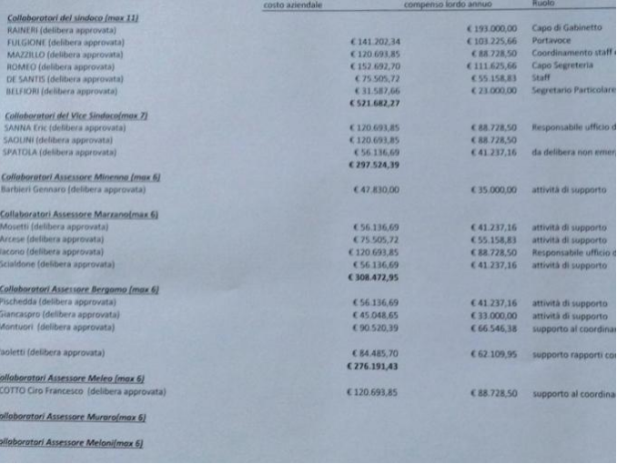Sono questi i compensi che i collaboratori della giunta di Virginia Raggi percepirebbero dalle casse comunali della Capitale . Il documento è stato presentato nel corso di una riunione avuta in Campidoglio tra i ventinove consiglieri grillini dell’assemblea capitolina e la Sindaca.