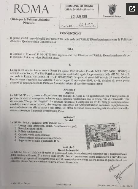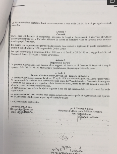 Un costruttore (imputato anche per associazione a delinquere e turbativa d’asta in un altro procedimento per i lavori dell’aula Giulio Cesare del Comune) che nel luglio 2009 grazie a una convenzione a trattativa diretta firmata da Marra, allora capo del dipartimento delle Politiche abitative, è riuscito a fare il colpo della vita: affittare al Comune capitolino 96 appartamenti di un residence fuori dal Grande raccordo anulare alla stratosferica cifra di 2,6 milioni l’anno. Pari a un costo medio per abitazione di 2.256 euro al mese. Il prezzo in pratica di una casa da 150 metri quadri in centro.Una maxi-richiesta davanti alla quale il braccio destro di Virginia non fa una piega. Anzi: all’ex ufficiale della Guardia di Finanza non dispiace nemmeno che le srl italiane proprietarie degli appartamenti siano controllate al cento per cento da società anonime con sede in Lussemburgo. Holding che poi finiranno nel mirino degli inquirenti per un presunto giro di false fatture da 11 milioni di euro.