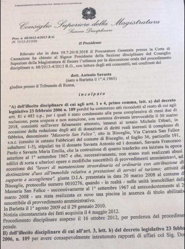 Savasta è stato ritenuto responsabile del cap A) dell’imputazione per il quale è stato rimosso dagli organismi giudiziari della magistratura, mentre è stato escluso l’addebito per quanto indicato al capo B)