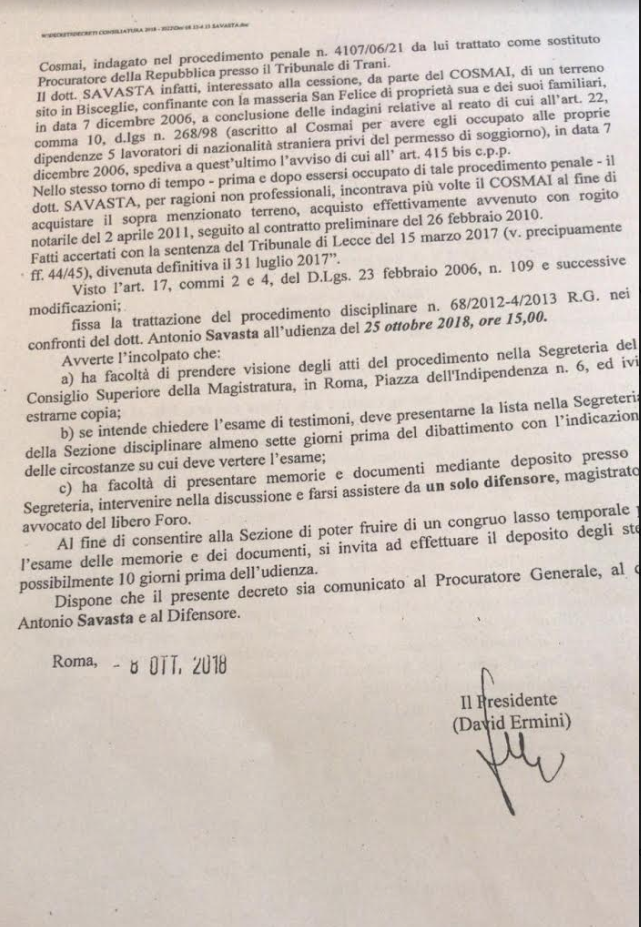 Il capo di incolpazione di Antonio Savasta al CSM