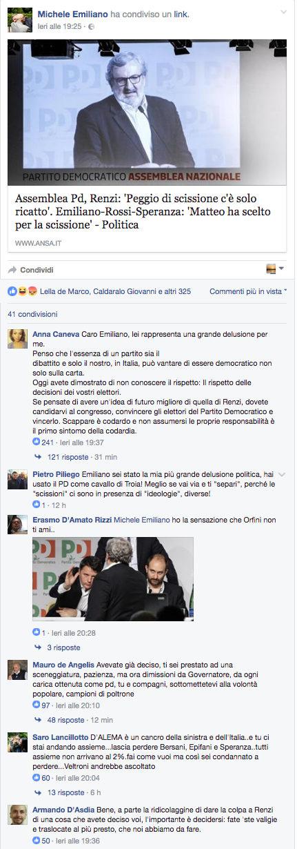 Un altro attento osservatore e commentatore della politica, Alessandro De Angelis dell’ Huffington Post ha scritto che “ ieri, dopo l’intervento di Emiliano in direzione, con voce rotta e accompagnato da un vistoso “dammi il cinque” a Renzi, cellulari e mail dei bersaniani sono stati inondati: “Scandaloso”, “questo è peggio di Renzi”, “non ci possiamo affidare a uno così”. Roberto Speranza si è dovuto precipitare a via Barberini, sede della Regione Puglia a Roma, per spiegargli che così è difficile. E mettere nero su bianco un comunicato “Renzi ha scelto la scissione”, dal sapore definitivo ma che definitivo non è, per Emiliano“.