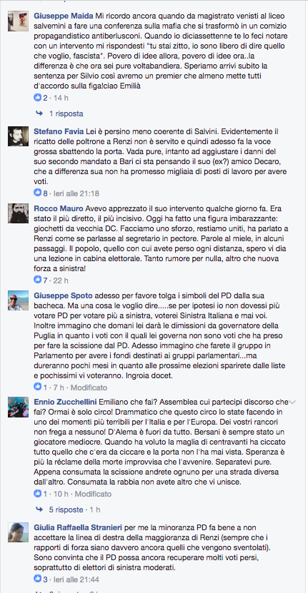 Immancabili ed impietose le reazioni del “popolo” dem sulla pagina Facebook di Emiliano :