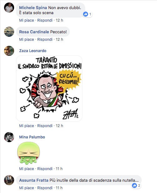 Riparto con la convinzione che, anche con il supporto di quei consiglieri con i quali in questa fase si è avviato un proficuo e responsabile dialogo, senza filtri e senza secondi fini, finalizzeremo presto i tanti progetti per la città e ci faremo apprezzare sempre di più dai tarantini. Ritiro oggi le mie dimissioni“
