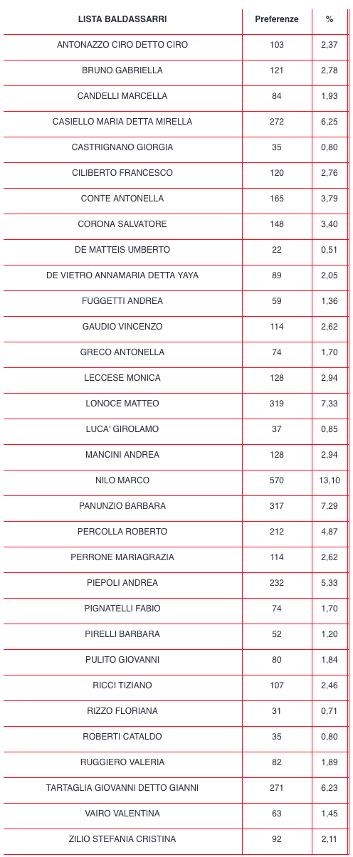 Queste le preferenze dei candidati al Consiglio comunale nelle liste a sostegno di Stefania BALDASSARI (centrodestra)