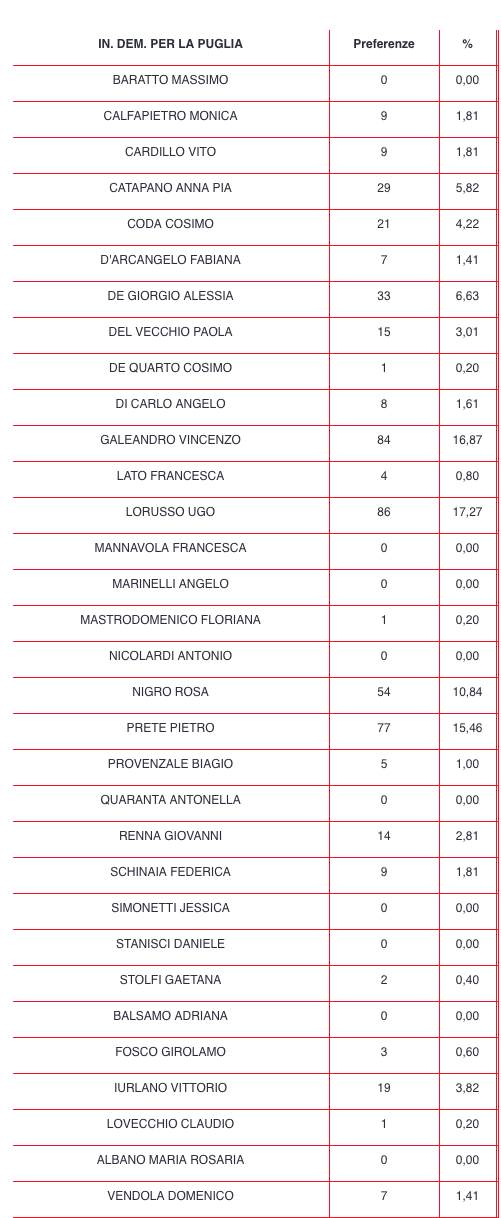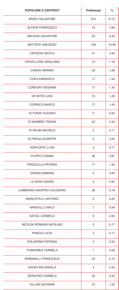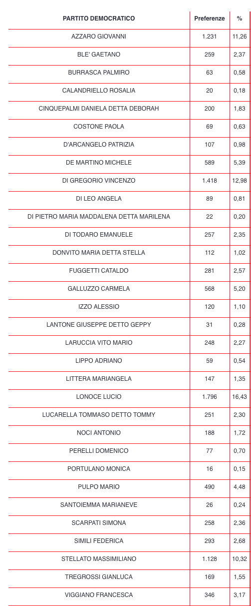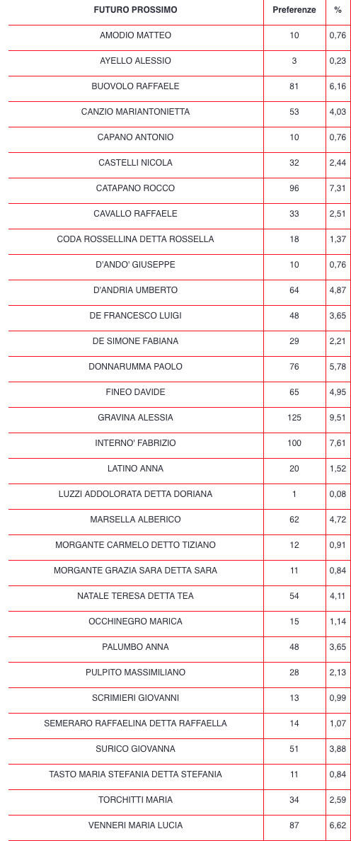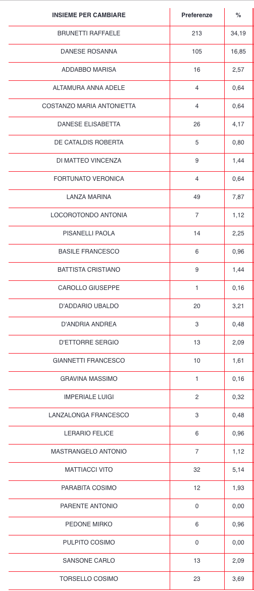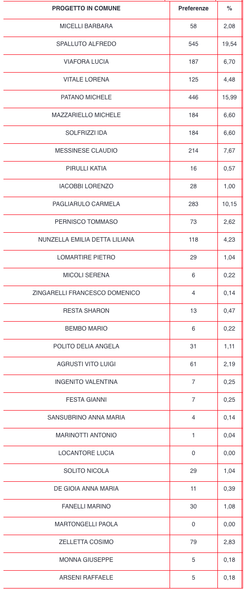 Queste le preferenze dei candidati al Consiglio comunale nelle liste a sostegno di Piero Bitetti (centrosinistra, poi confluito al 2° turno con MELUCCI) ex iscritto nel PD. noto prevalentemente per i torbidi giri di faccendieri ed affaristi che circolano nel suo entourage, e per una sua specialità: cercare di far pagare ai contribuenti lo stipendio a sua moglie, alla sua ex fidanzata ed a qualche “amichetta” del cuore” !