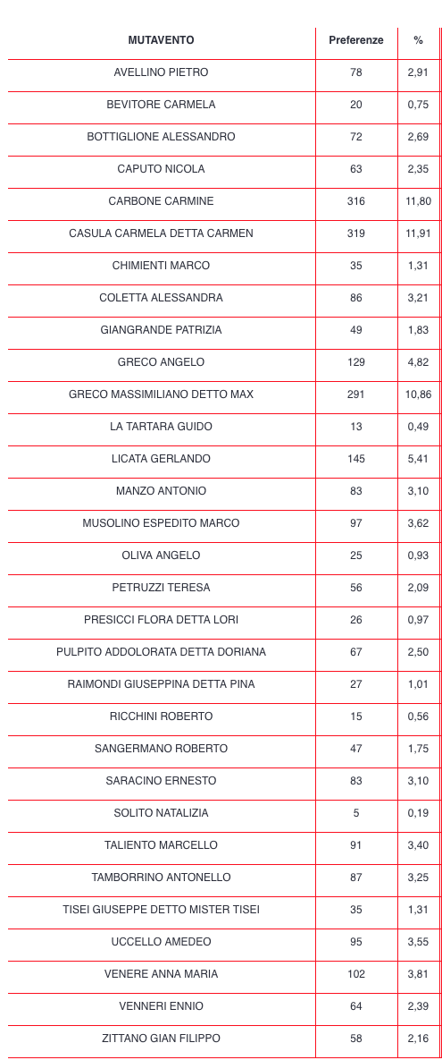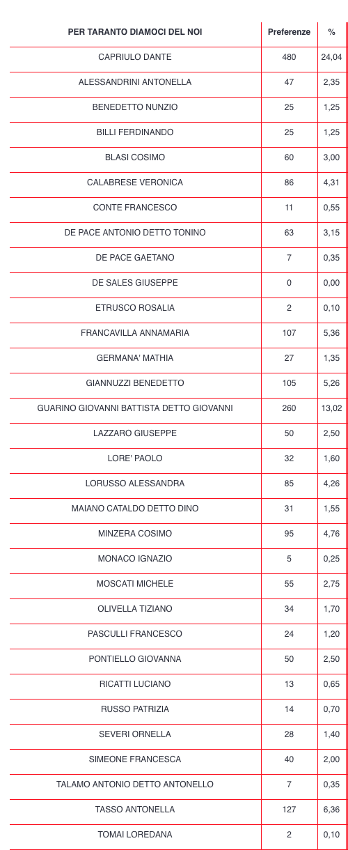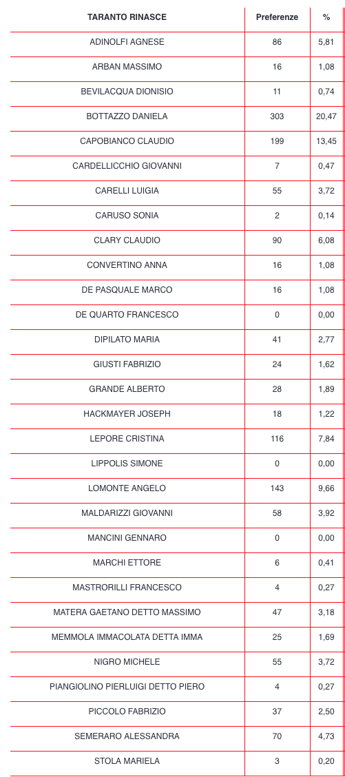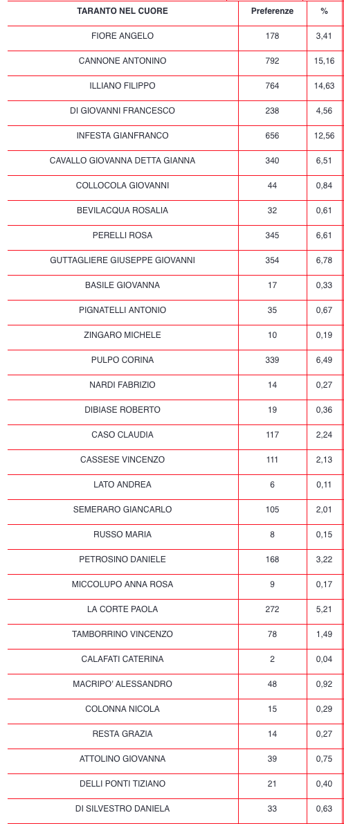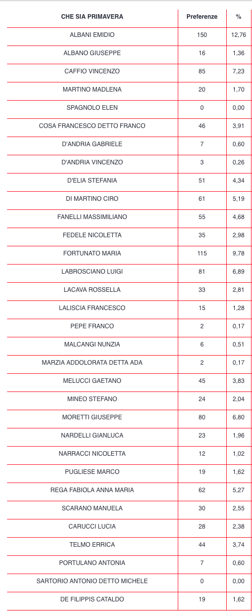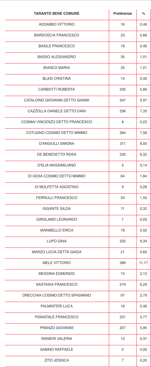 Ma per capire ancora meglio il peso elettorale di ciascun candidato, eccovi i risultati lista per lista, voto per voto. Queste le preferenze al 1° turno dei candidati al Consiglio comunale nelle liste a sostegno di Rinaldo MELUCCI (centrosinistra)