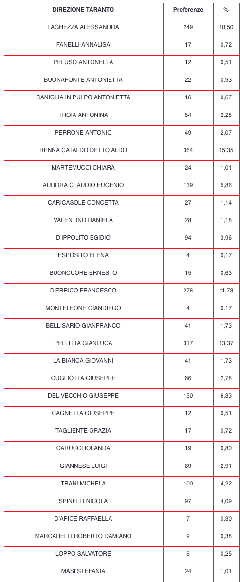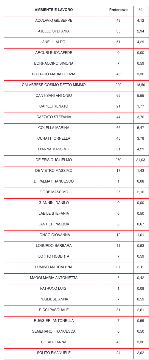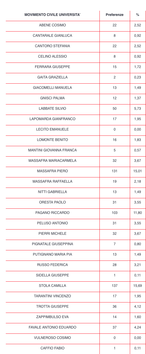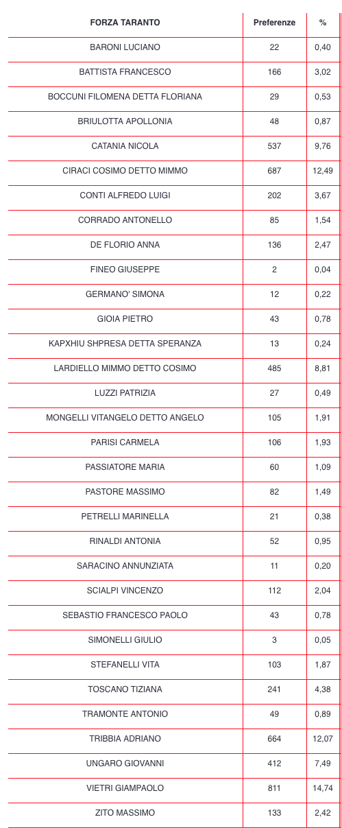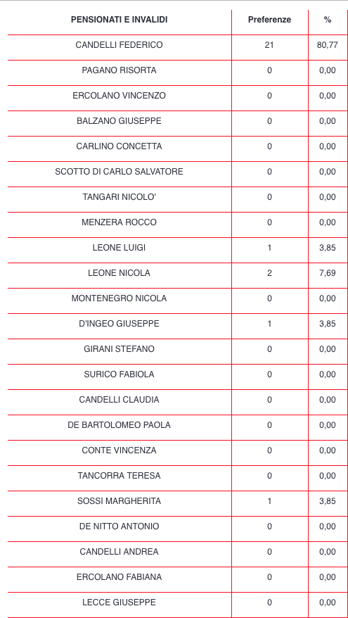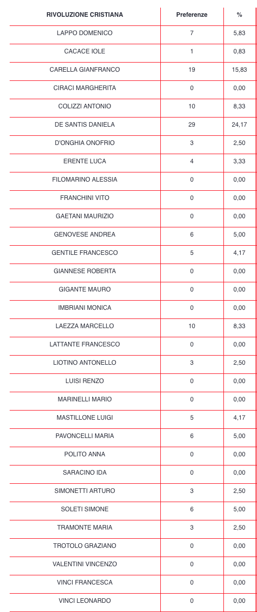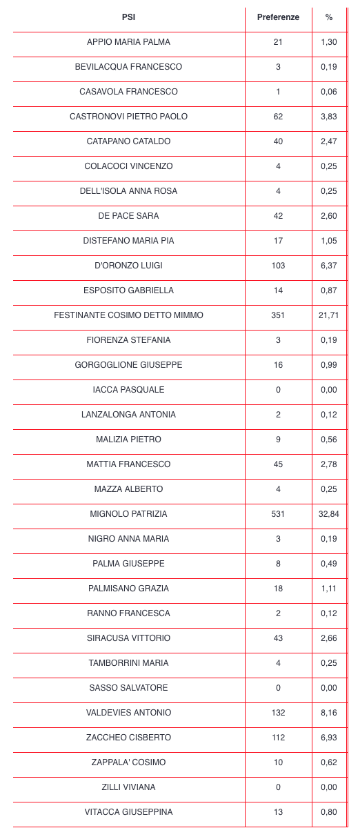 Ma per capire ancora meglio il peso elettorale di ciascun candidato, eccovi i risultati lista per lista, voto per voto. Queste le preferenze al 1° turno dei candidati al Consiglio comunale nelle liste a sostegno di Rinaldo MELUCCI (centrosinistra)